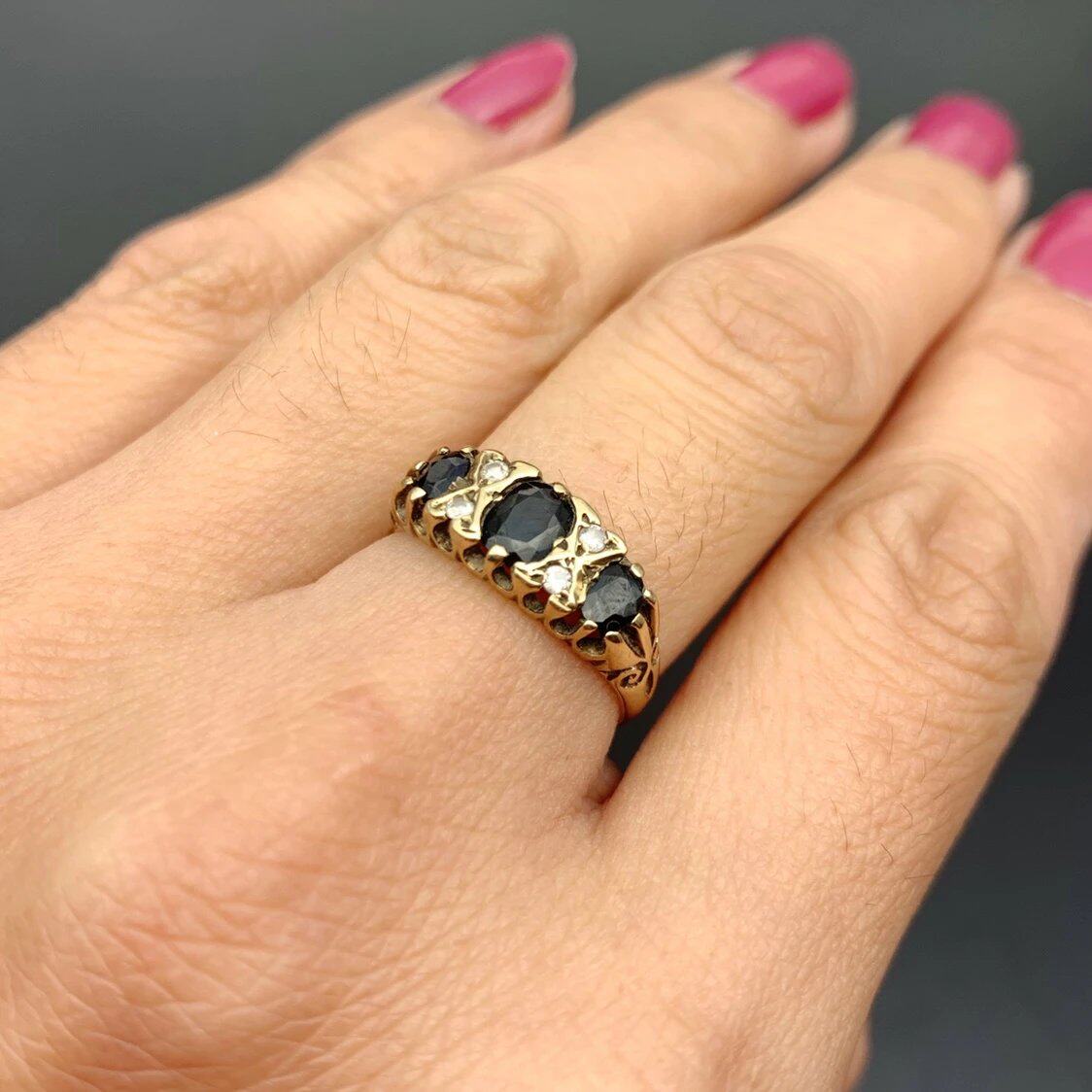 Сапфировое бриллиантовое ретро кольцо, антикварное ювелирное украшение, золото 9 карат