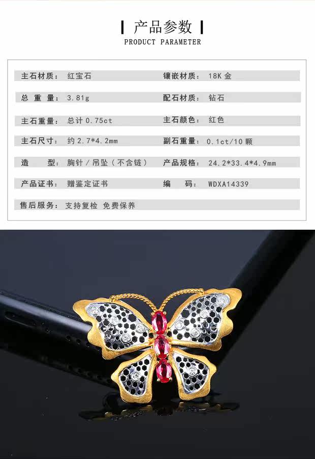 Рубиновая подвеска, брошь, (в наличии на складе), 0.75 карат, золото 750 пробы