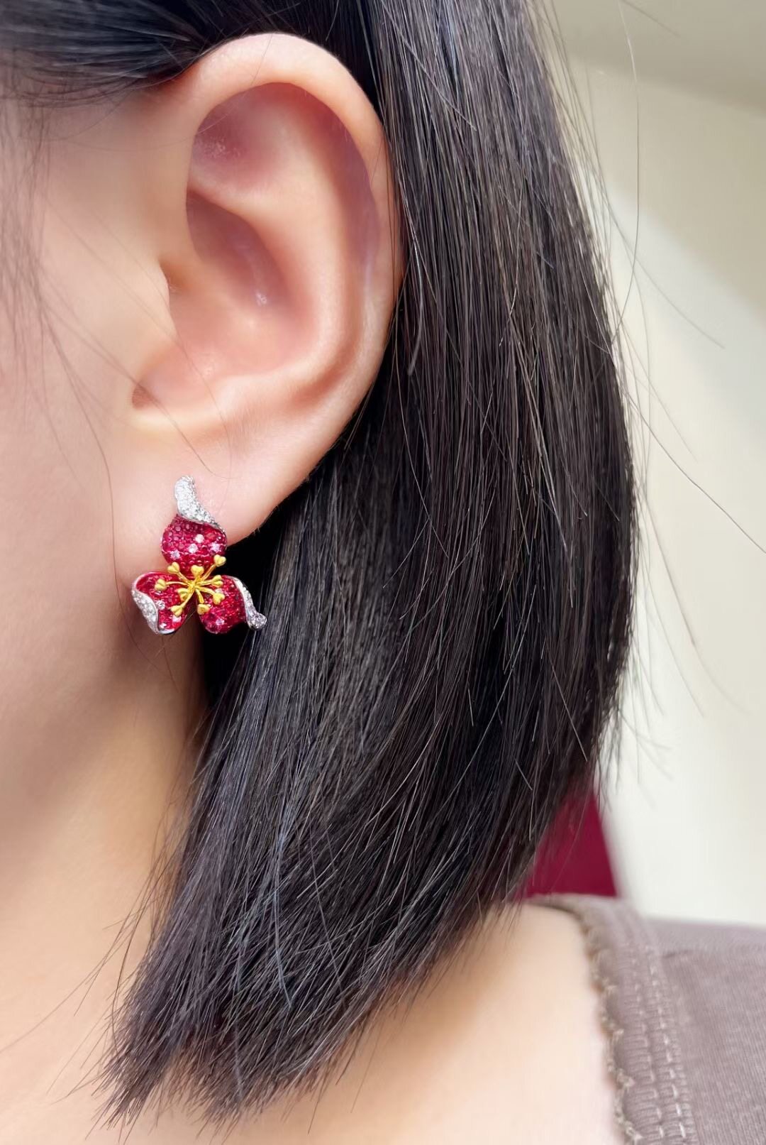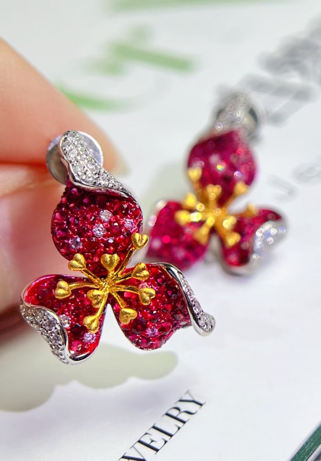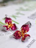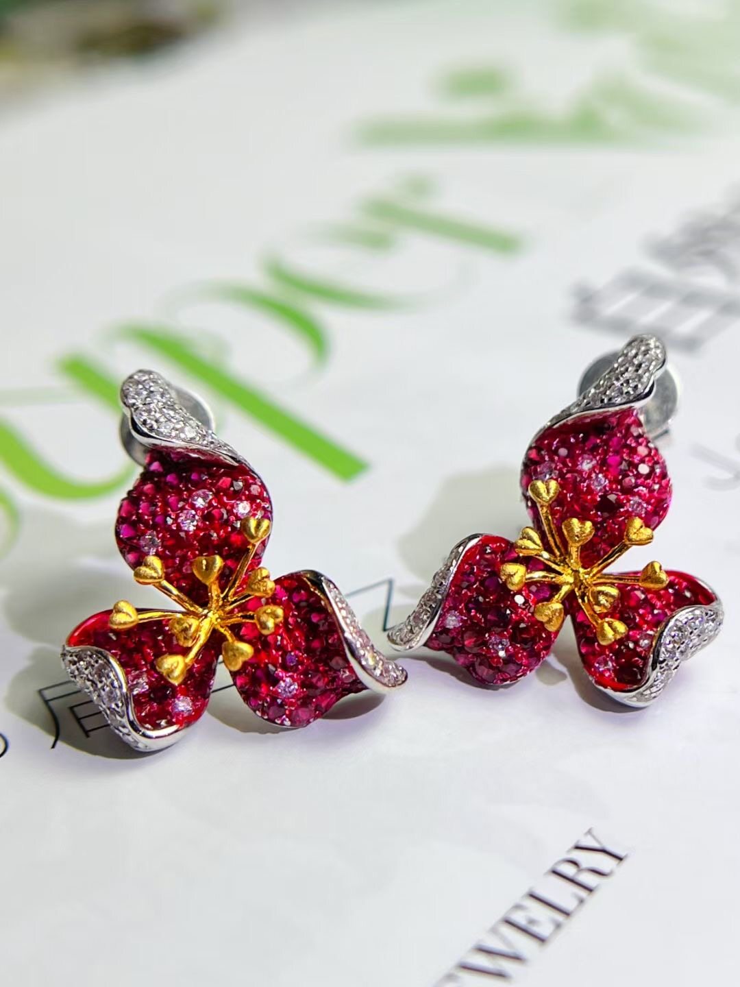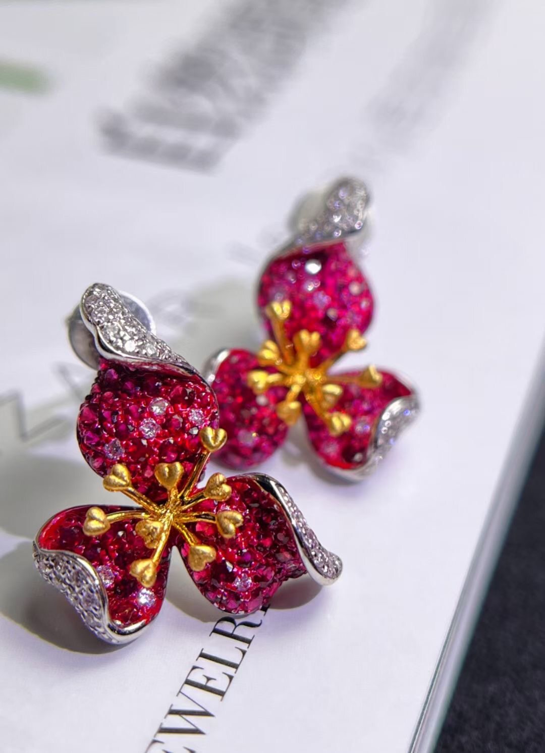 Натуральная рубиновая инкрустация камня, трехмерные дизайнерские серьги, золото 750 пробы, инкрустировано бриллиантами, премиум класс