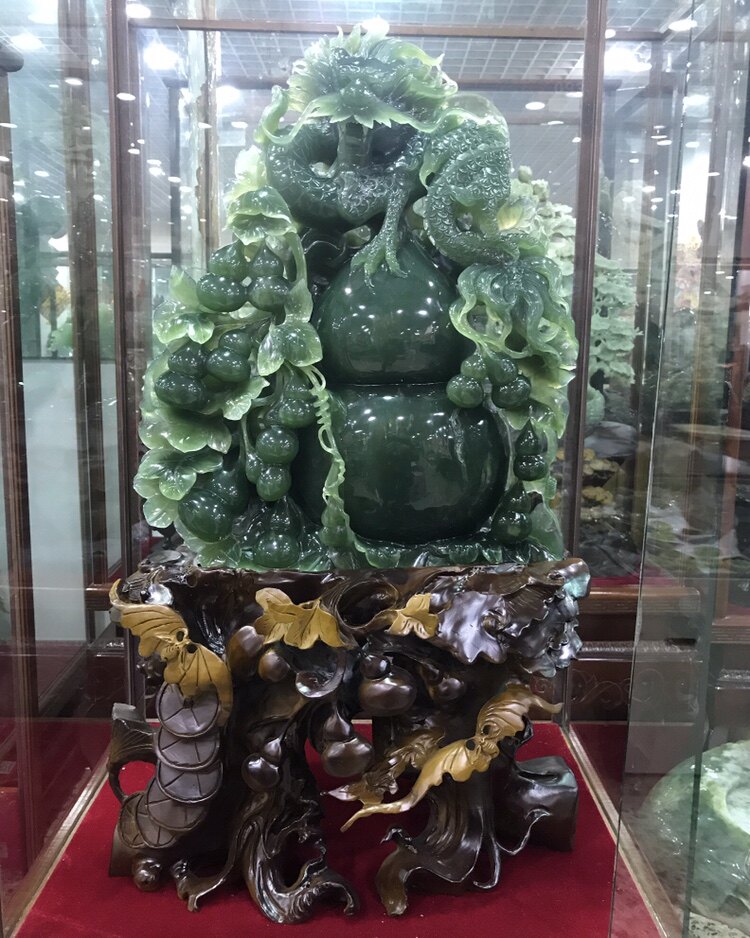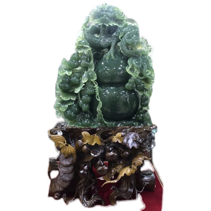 Премиальные крупномасштабные нефритовые украшения Xiuyan: драконы и тыквы, что означает, что они драконы от поколения до поколения. Нефрита имеет чистую ширину, толщину, высоту 36*20*51 см, включая базовую высоту 78 см.