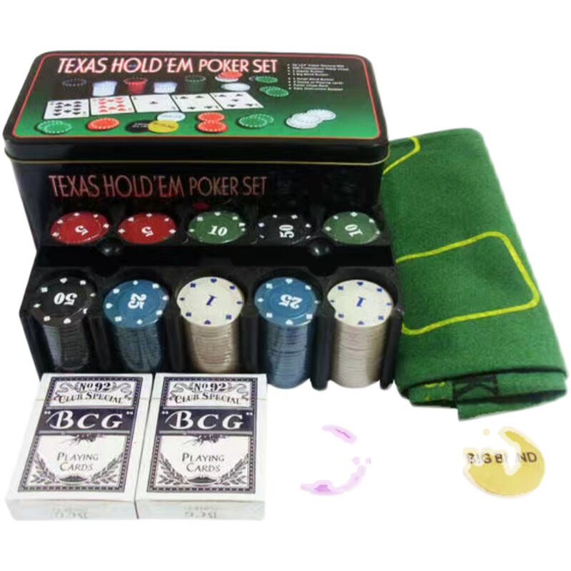 Композиция: 200 кусочков чипов+покер 2 пары+скатерти один+код Zhuang/ Big Blind/ Small Blind каждый Спецификация железной коробки: 24 см*12 см*11 см. Технические характеристики пластиковой рамы: 21см*11см*6,8 см.