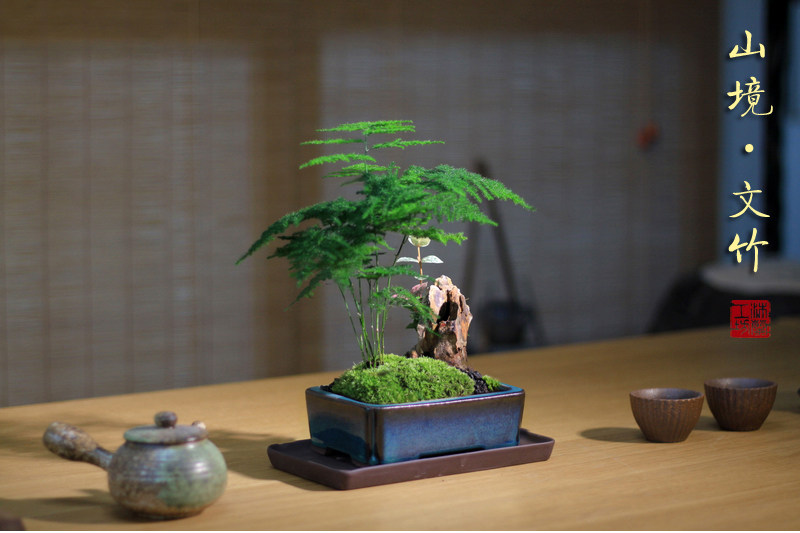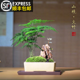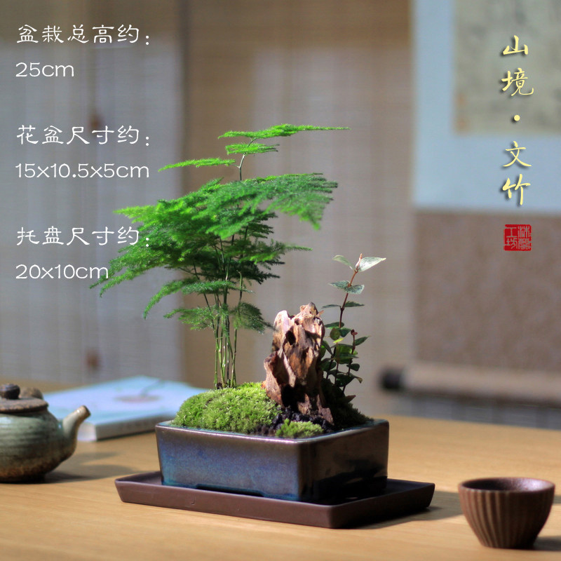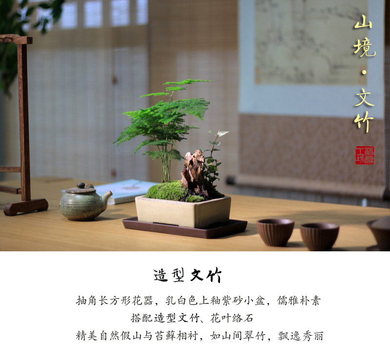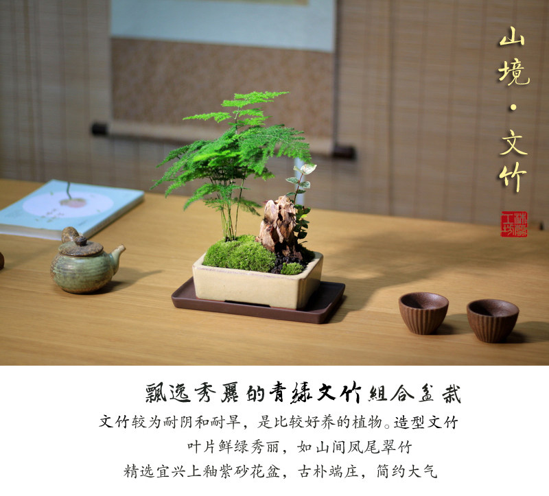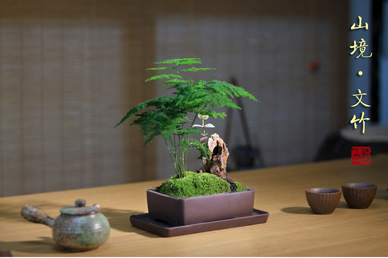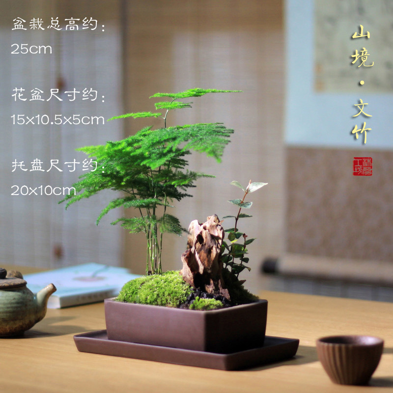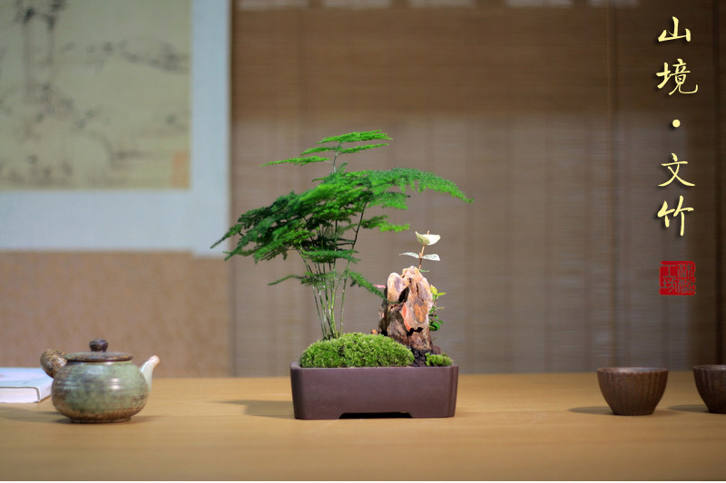 Бамбук -фиолетовый песчаный мох микроандшафт маленький горшок из китайского стиля в стиле китайского стиля дзен дзен чайный чай на рабочем столе Зеленое растение зеленое растение вечнозеленое