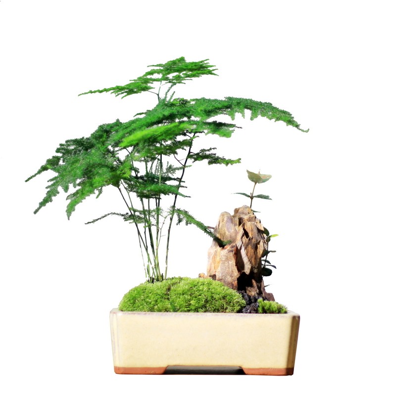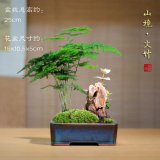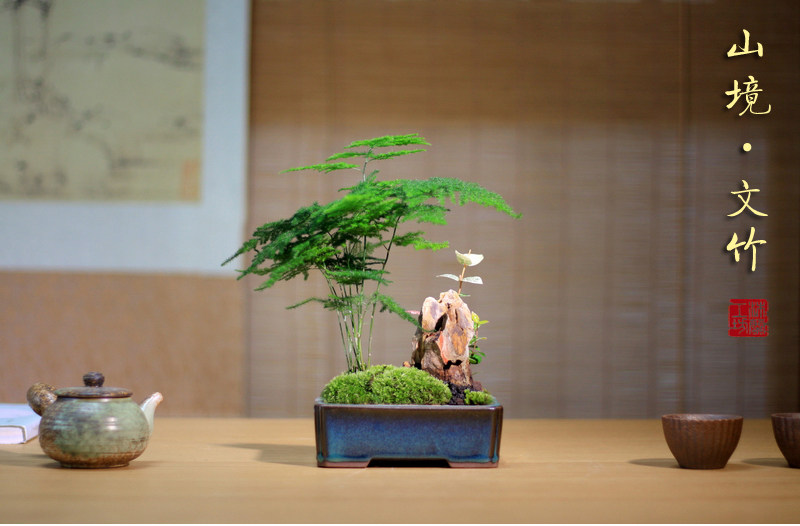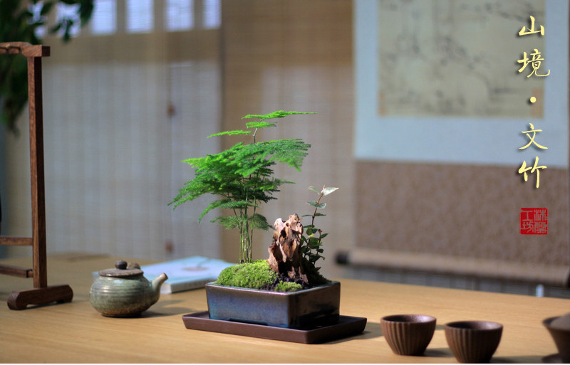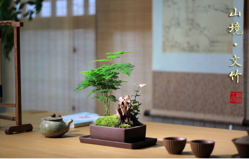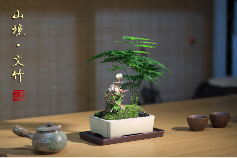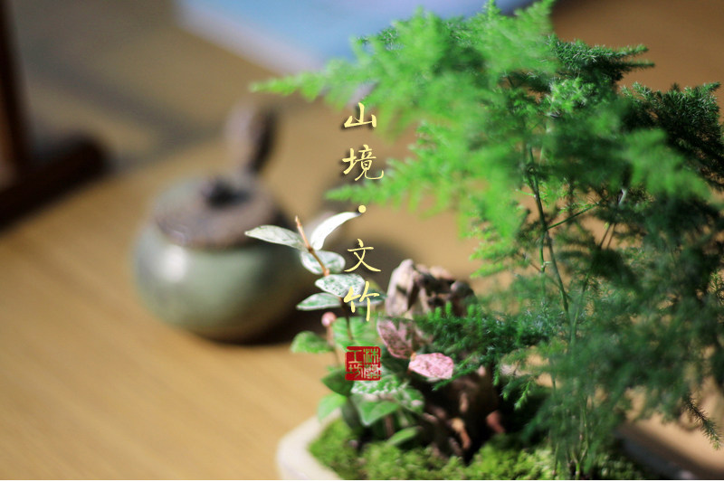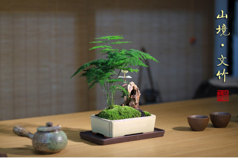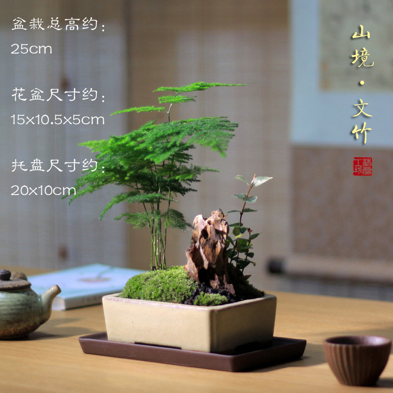 Бамбук -фиолетовый песчаный мох микроандшафт маленький горшок из китайского стиля в стиле китайского стиля дзен дзен чайный чай на рабочем столе Зеленое растение зеленое растение вечнозеленое