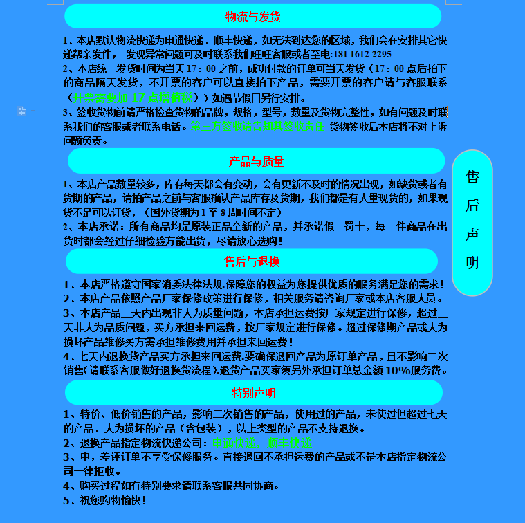 Инструкции по магазину:Пожалуйста, свяжитесь с обслуживанием клиентов, чтобы подтвердить количество запасов перед заказом продукта, потому что складский груз часто вводит и выходит, чтобы избежать откладывания вашего времени.Если владелец магазина не может ответить вовремя, пожалуйста, сразитесь с 24 -часовой горячей линией: 18116122295