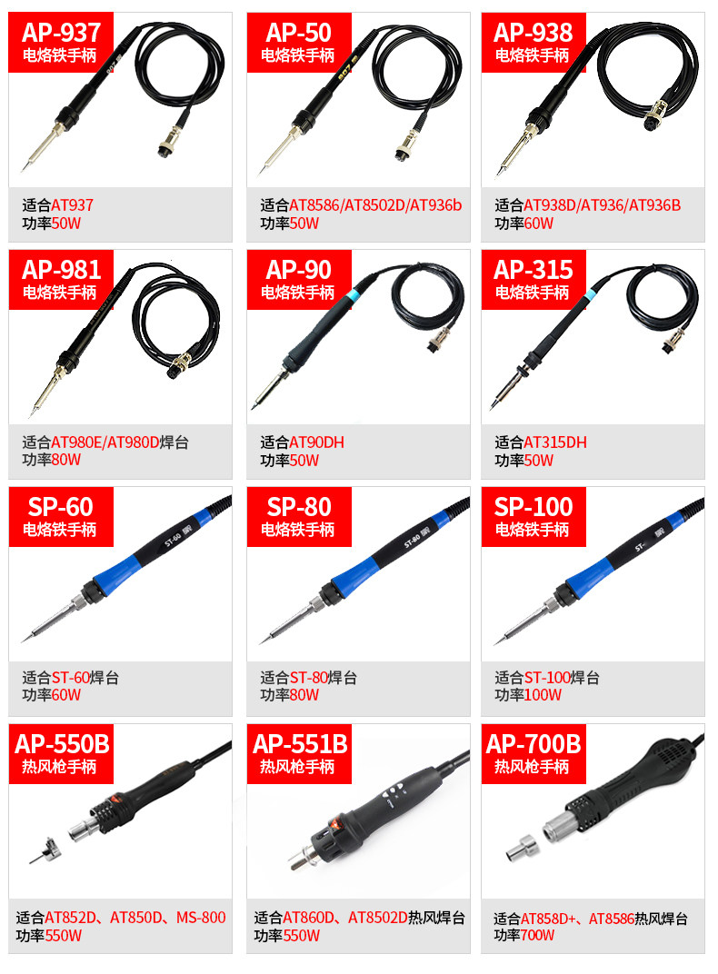 | Цвет: | AT937 паяльная железная ручка, AT937A паяльная железная ручка, AT938D Splering Iron Hand, AT980E пайковая железная ручка, At8586, AT8502D -паяльный железный ручка, ST60 паяльный железный ручка, ST80 паяльный железный ручка, ST100 паяльная железная ручка, AT90DH паяльная железная ручка железа, AT315DH паяльная железная ручка, Рукоятка пневматического пистолета AT8586 (новый стиль), Рукоятка пневматического пистолета AT8586 (старого образца), Рукоятка пневматического пистолета AT858D+ (новый стиль), Рукоятка пневматического пистолета AT858D+ (старого образца), Рукоятка пневматического пистолета AT850D (новая модель), Рукоятка пневматического пистолета AT850D (старая модель), Рукоятка пневматического пистолета AT852D (новый стиль), Рукоятка пневматического пистолета AT852D (старого образца), AT860D Ручка с ветряным оружием, AT8502D Ручка с ветряным оружием |