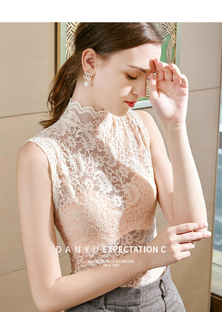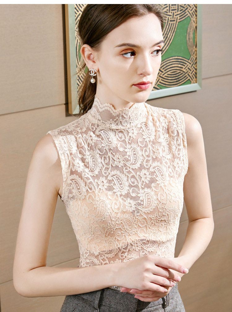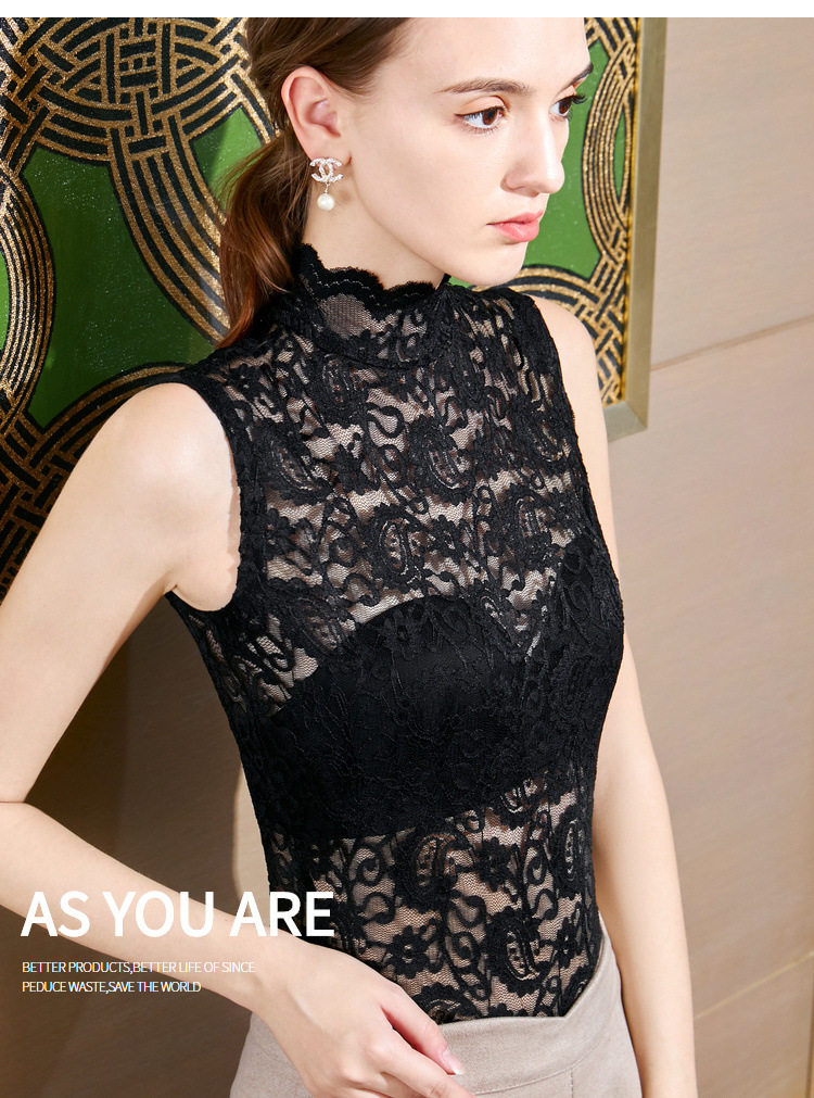 Кружевная сексуальная базовая приятная телу майка топ без рукавов, высокий воротник, в обтяжку