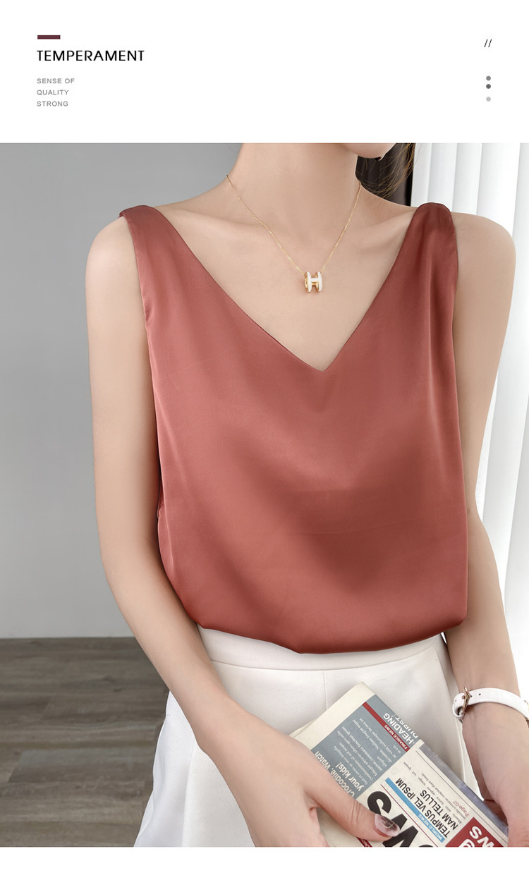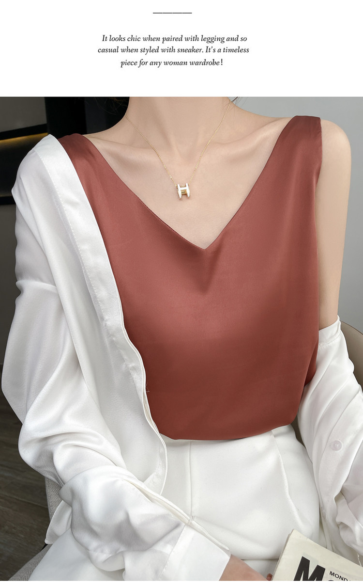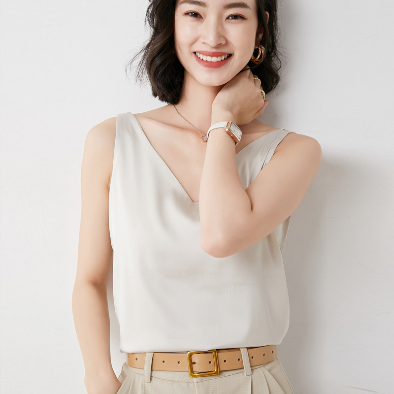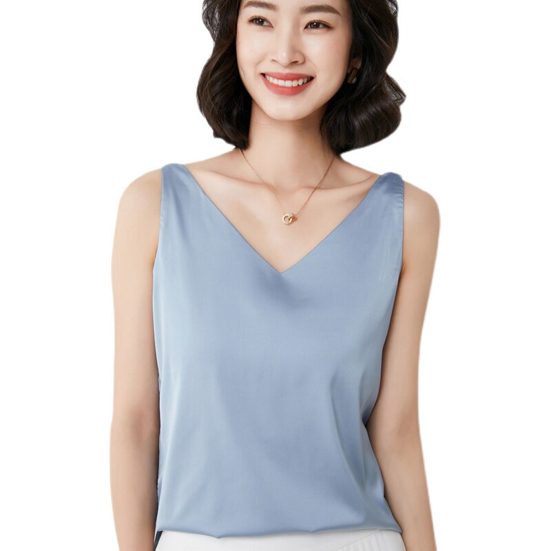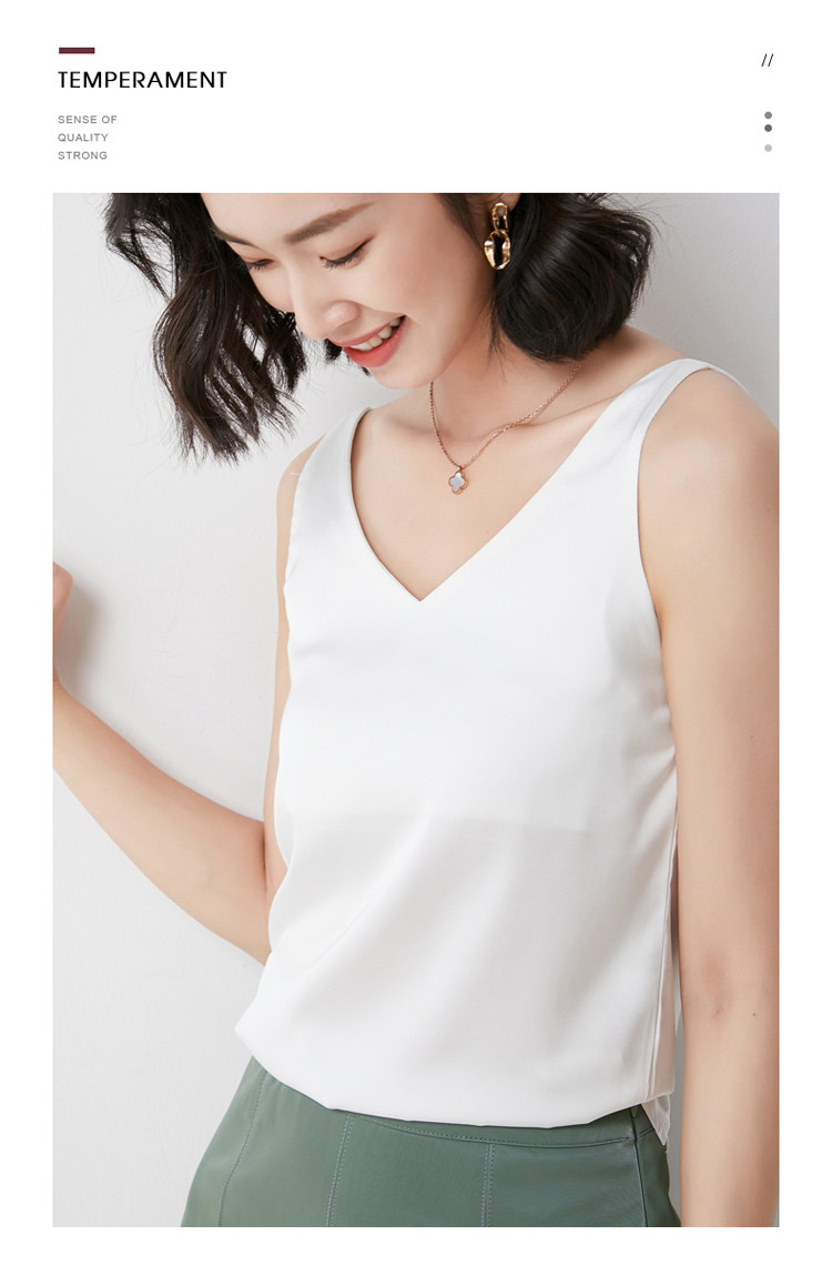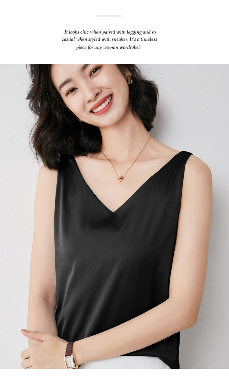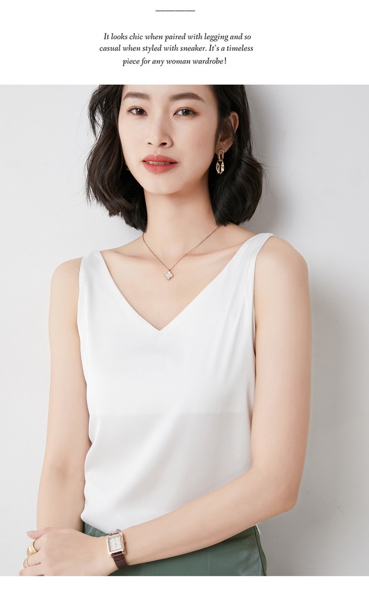 Шелковая майка топ, белый черный базовый шелковый летний костюм, V-образный вырез