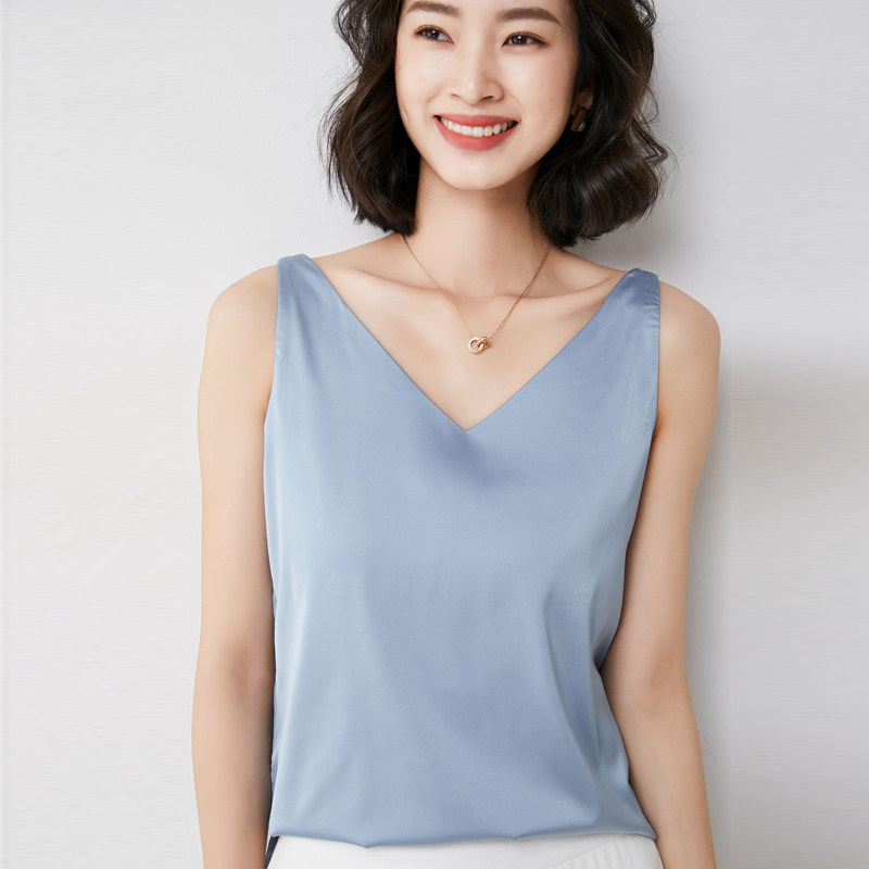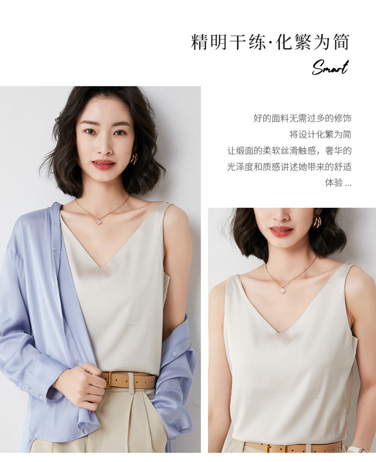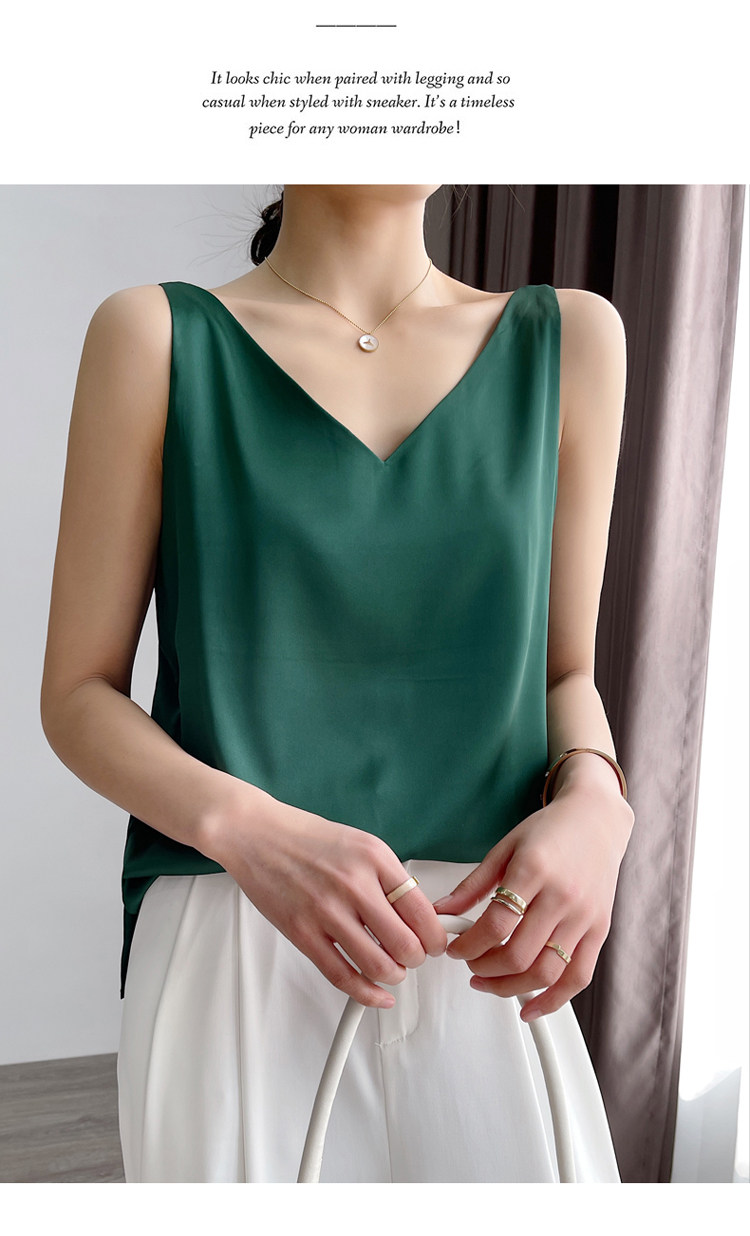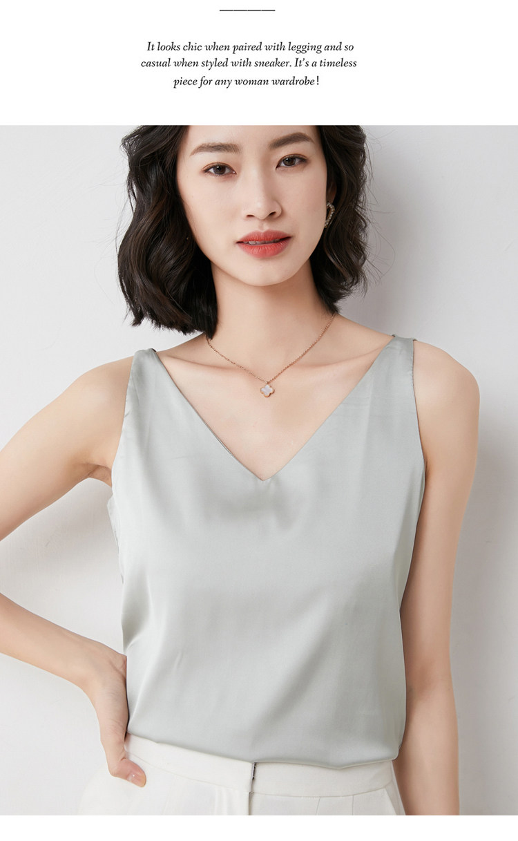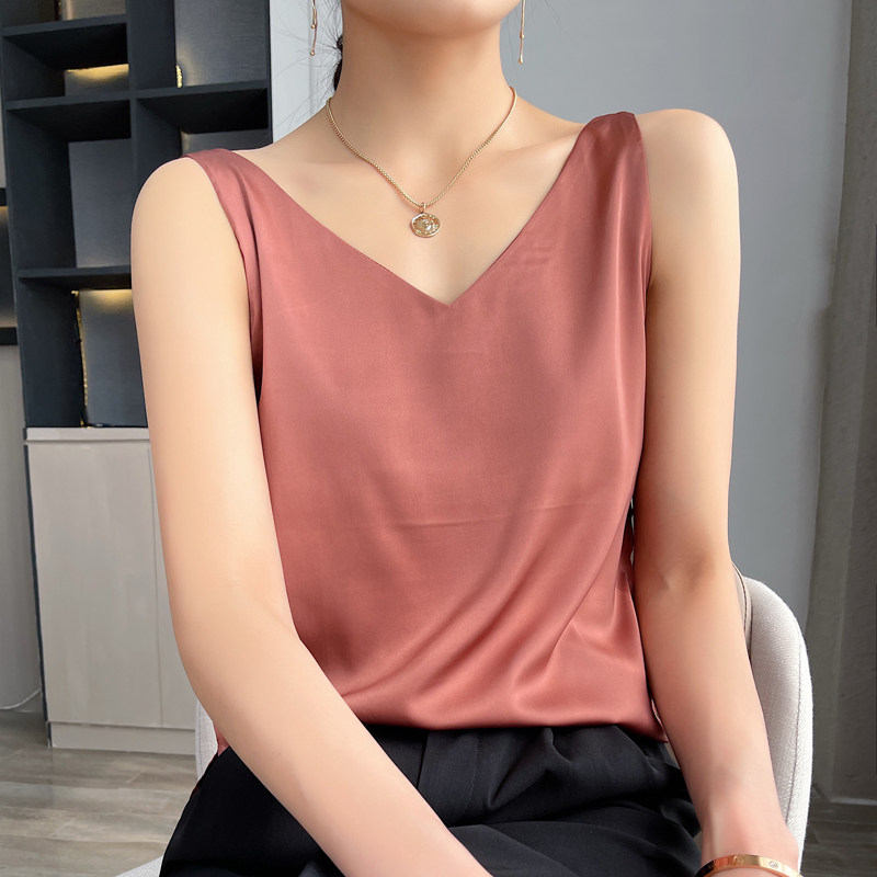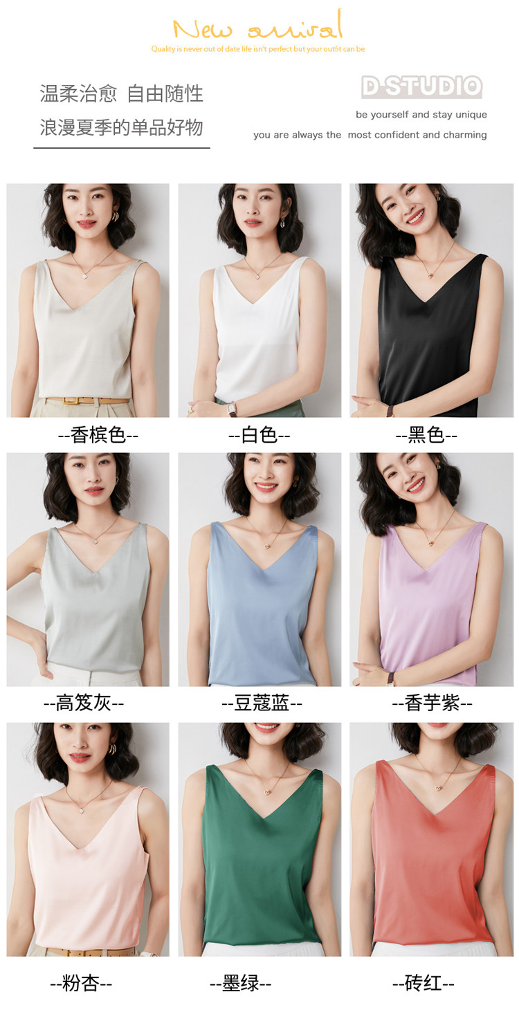 Шелковая майка топ, белый черный базовый шелковый летний костюм, V-образный вырез