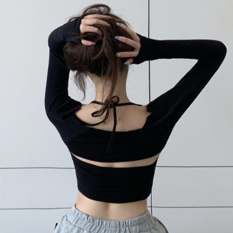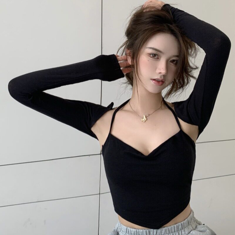 Демисезонная тонкая футболка, сексуальный короткий жилет, черный лонгслив, защита от солнца