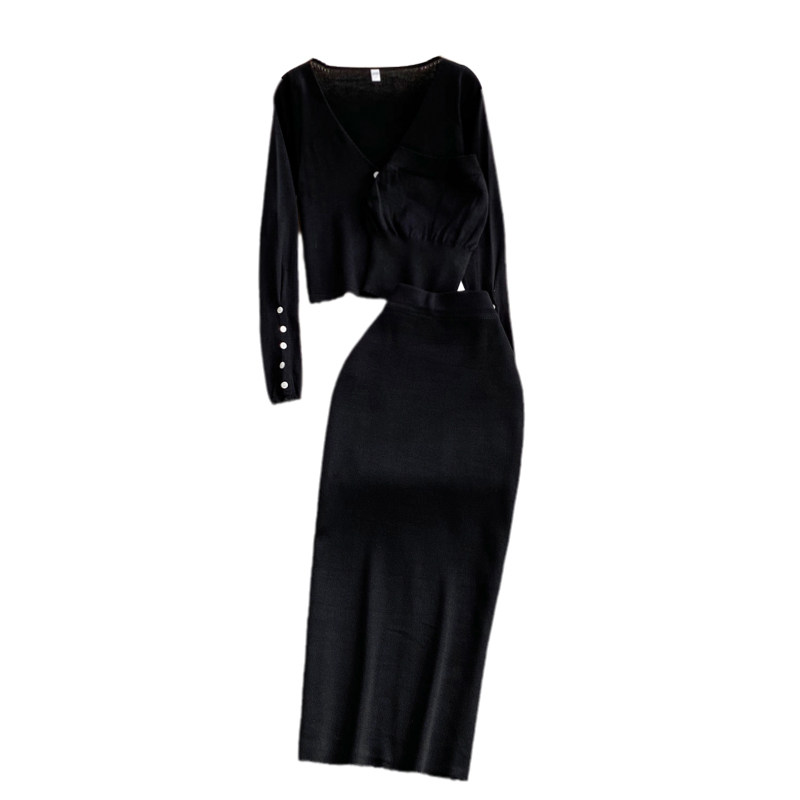 Осенний бюстгальтер-топ, трикотажный кардиган, комплект, поясная сумка, юбка, в корейском стиле, в западном стиле, V-образный вырез, 3 предмета, высокая талия