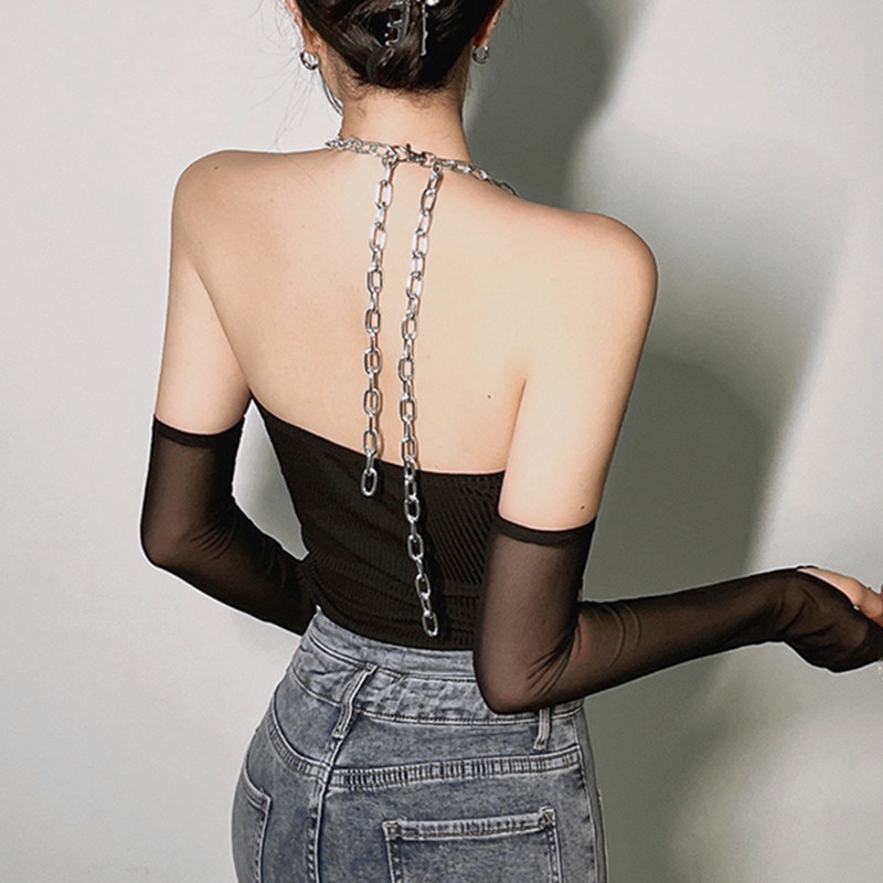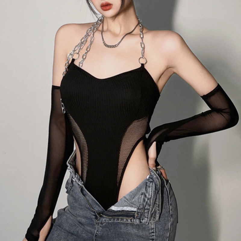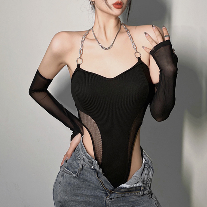 Сексуальная черная цепь, летнее боди, нарукавники, жилет, с открытой спиной, облегающий крой