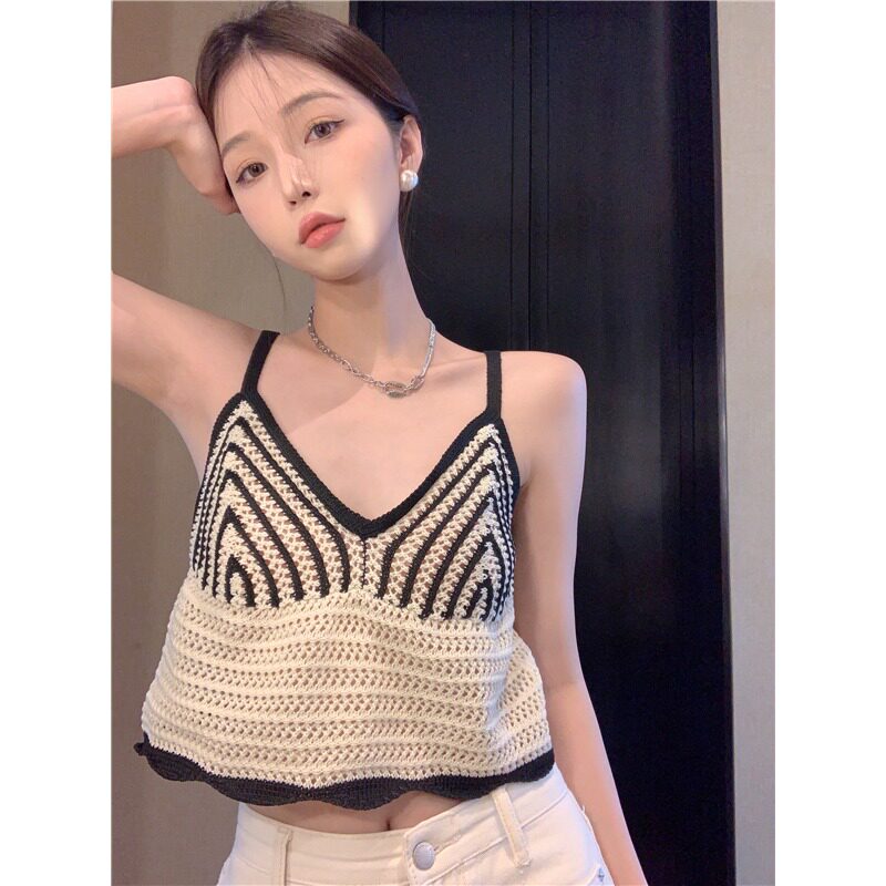 Дизайнерская трикотажная плетеная короткая майка, жилет без рукавов, термобелье, французский стиль, V-образный вырез, красивая спина