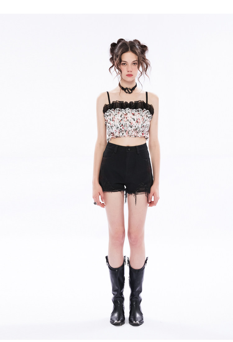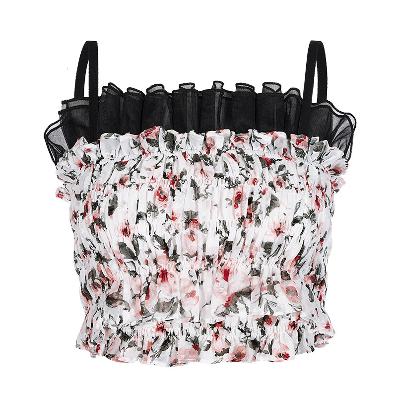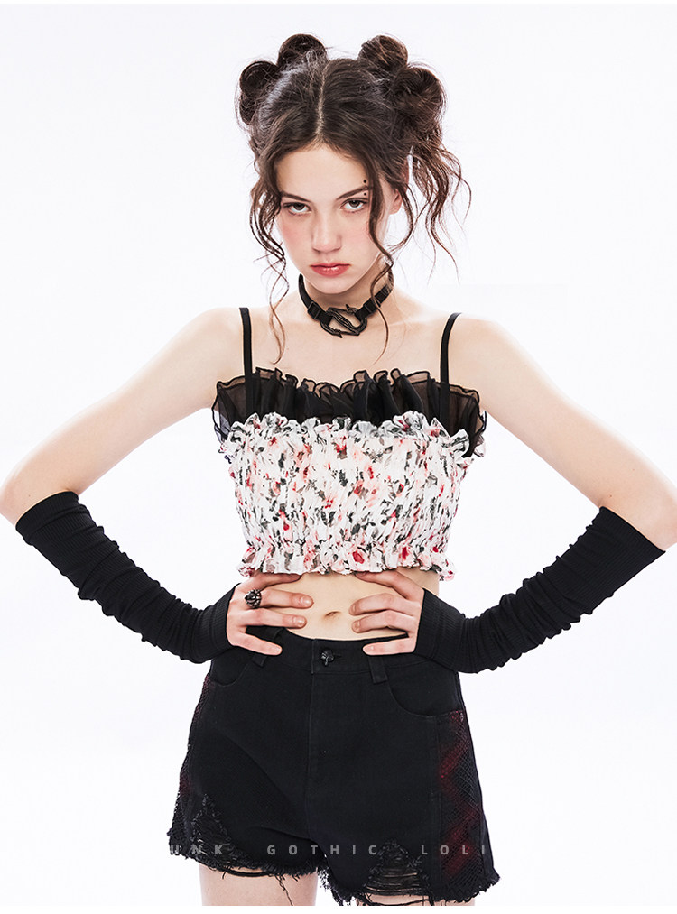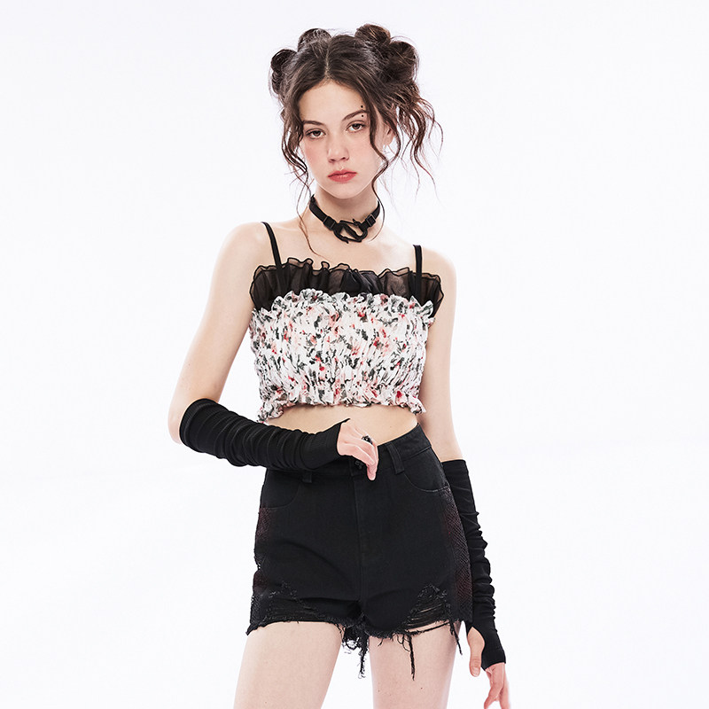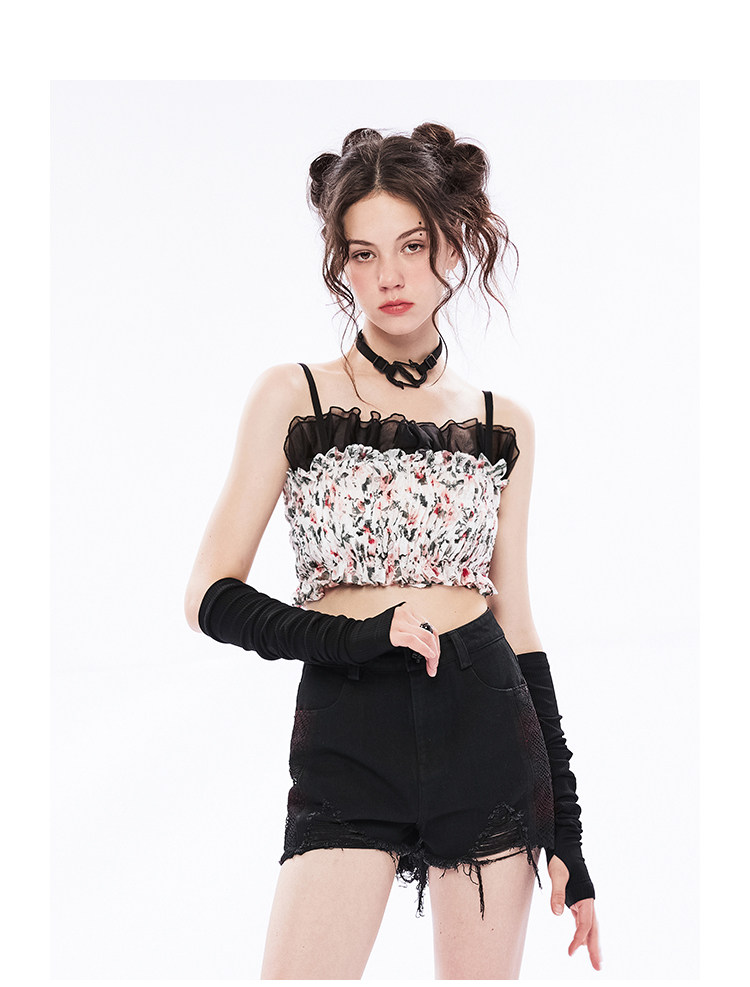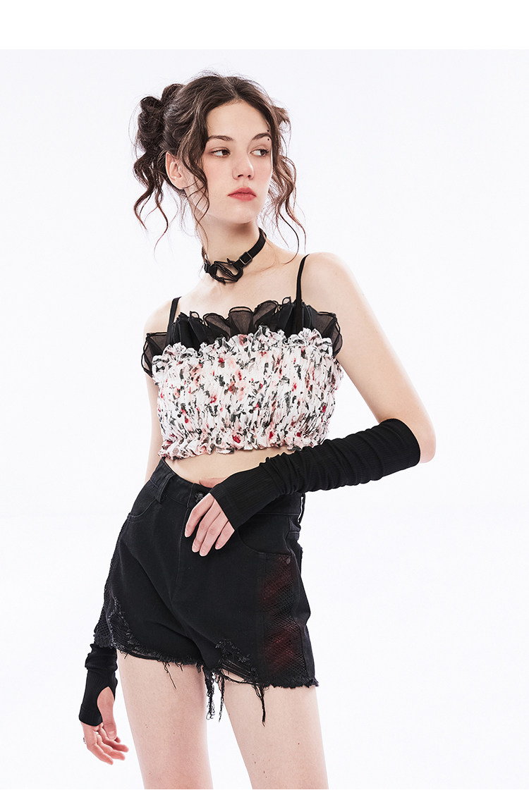Дизайнерская короткая майка топ без рукавов, цветочный принт, тренд сезона, облегающий крой