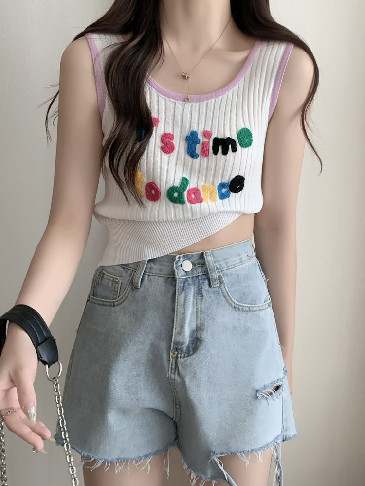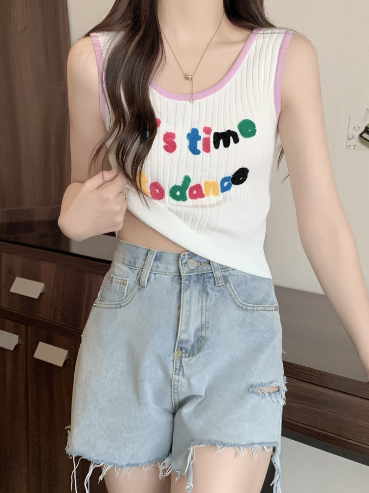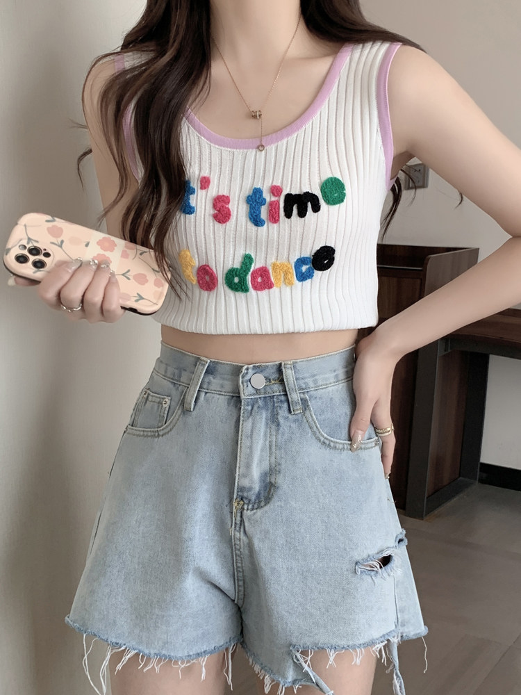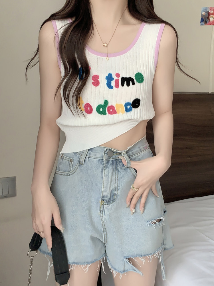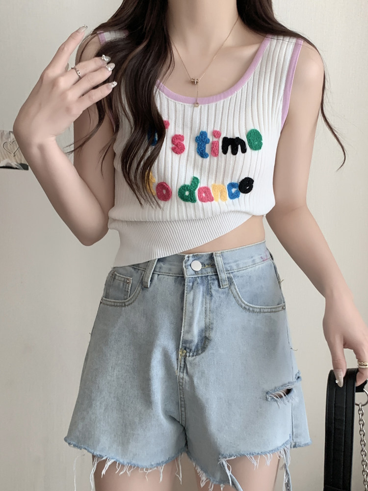 Короткая летняя трикотажная майка топ без рукавов, большой размер, с вышивкой