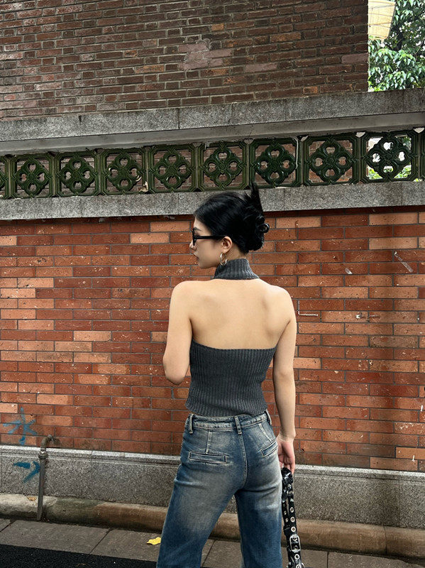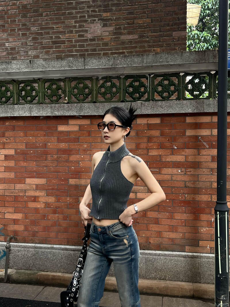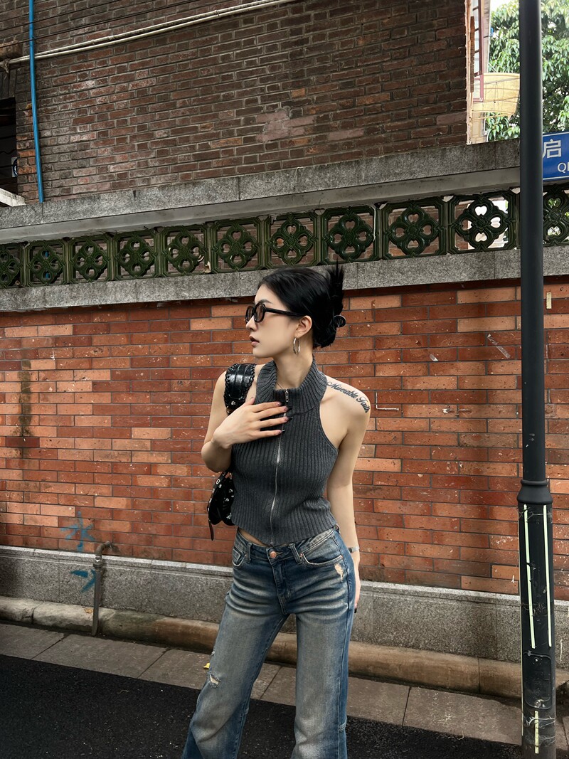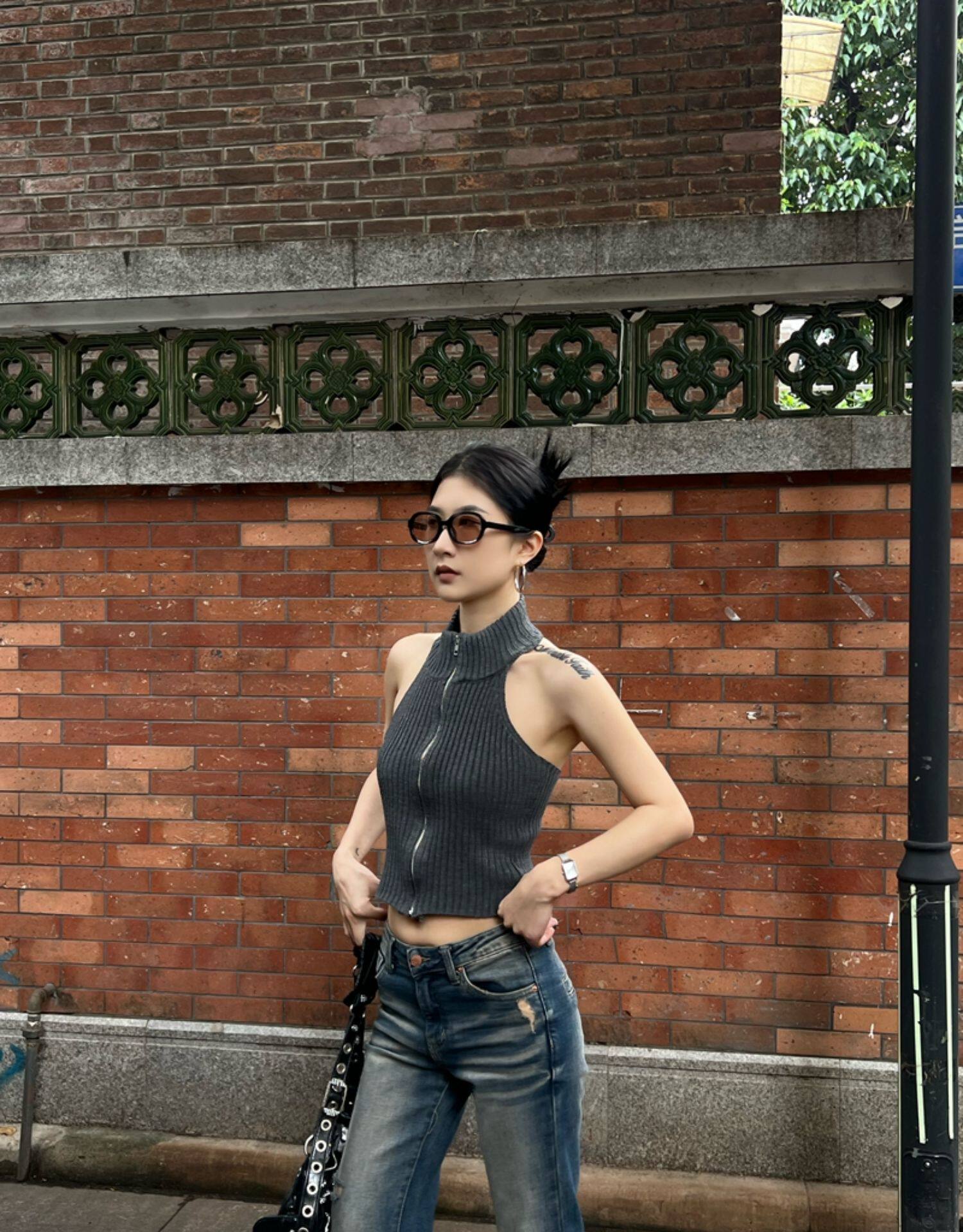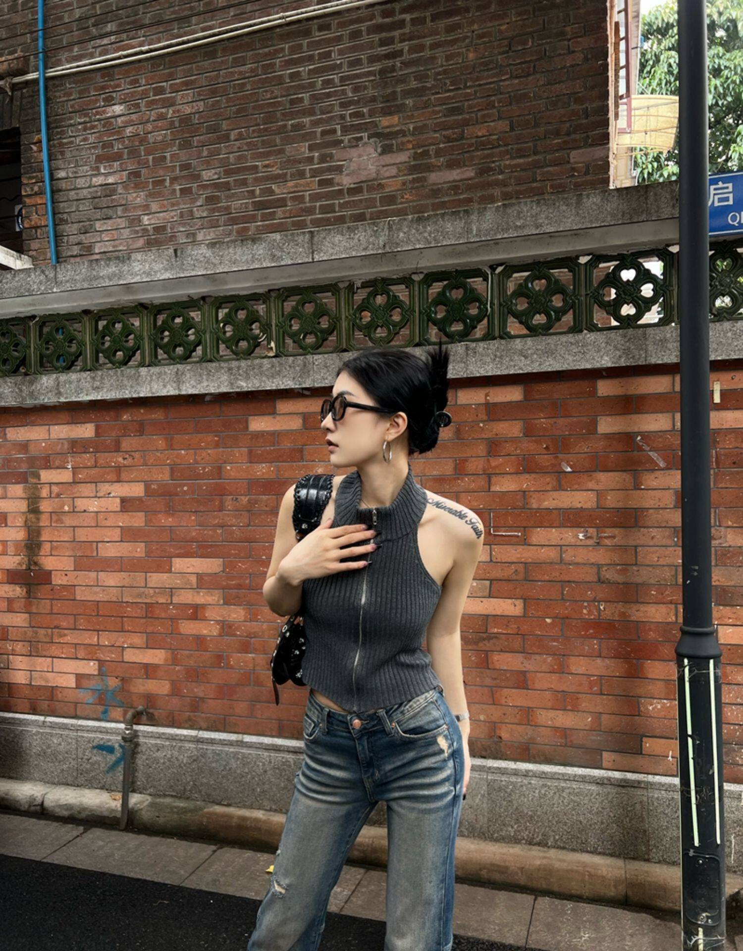 Тонкая майка топ без рукавов с молнией, сексуальный трикотажный свитер, изысканный стиль, яркий броский стиль, с открытой спиной