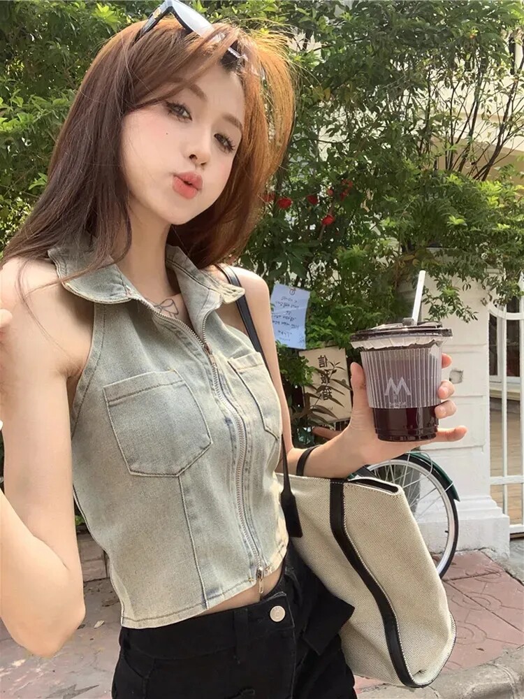 Дизайнерская джинсовая летняя короткая майка, тренд сезона, воротник поло, с открытой спиной, облегающий крой