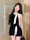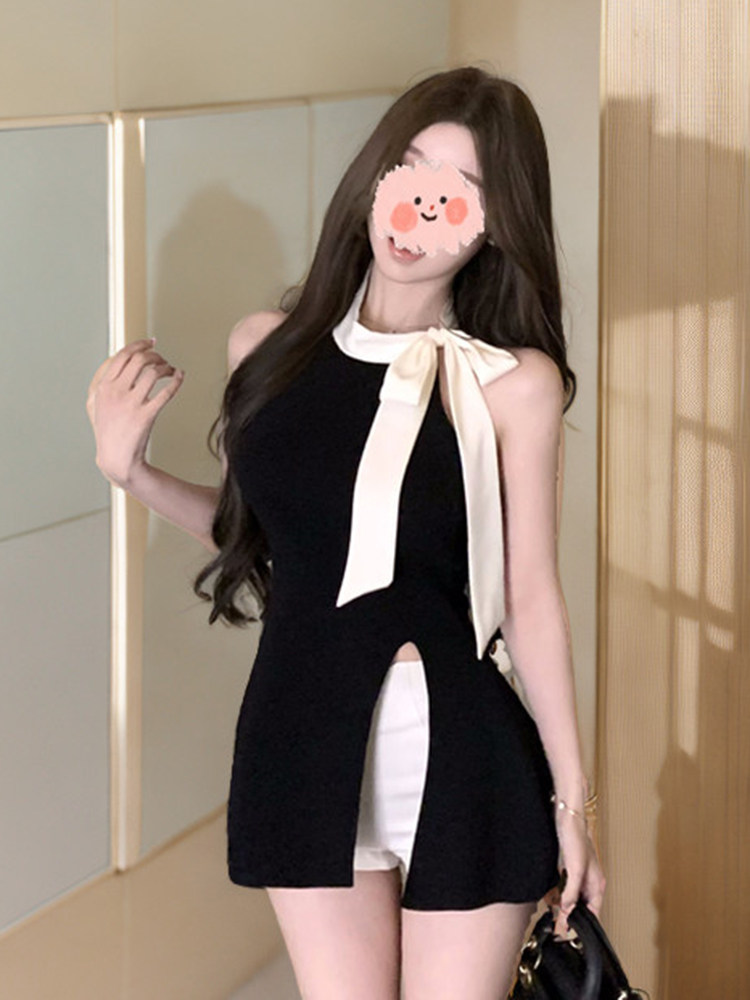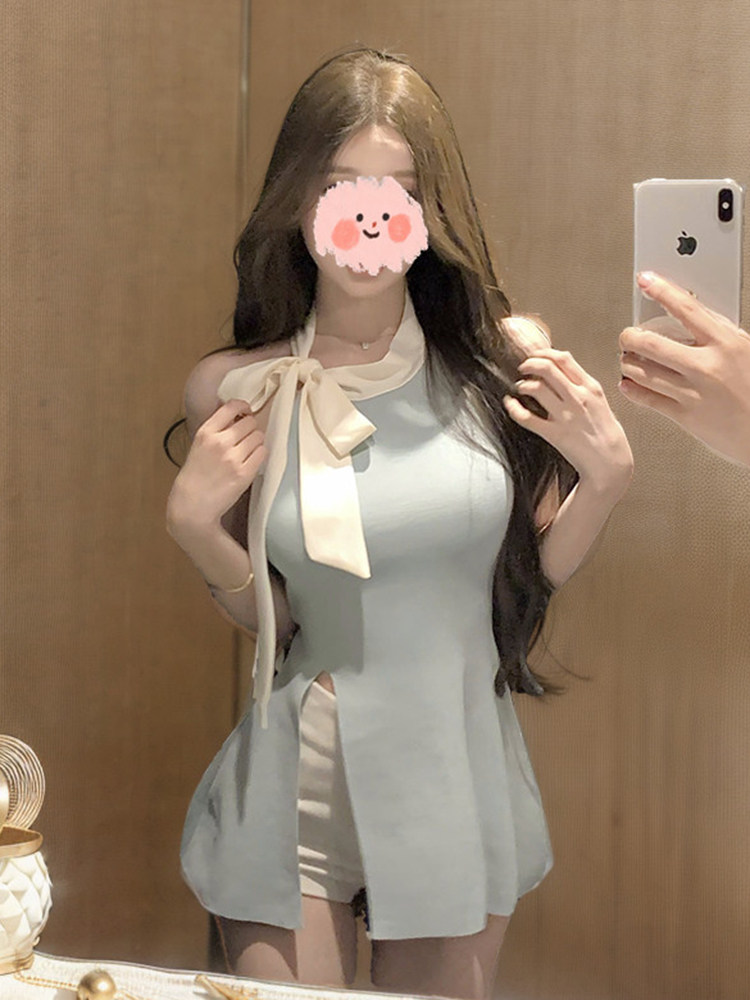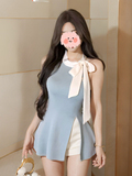 Трикотажный бюстгальтер-топ с бантиком, дизайнерская майка топ, синяя футболка без рукавов, с открытой спиной, облегающий крой, тренд сезона