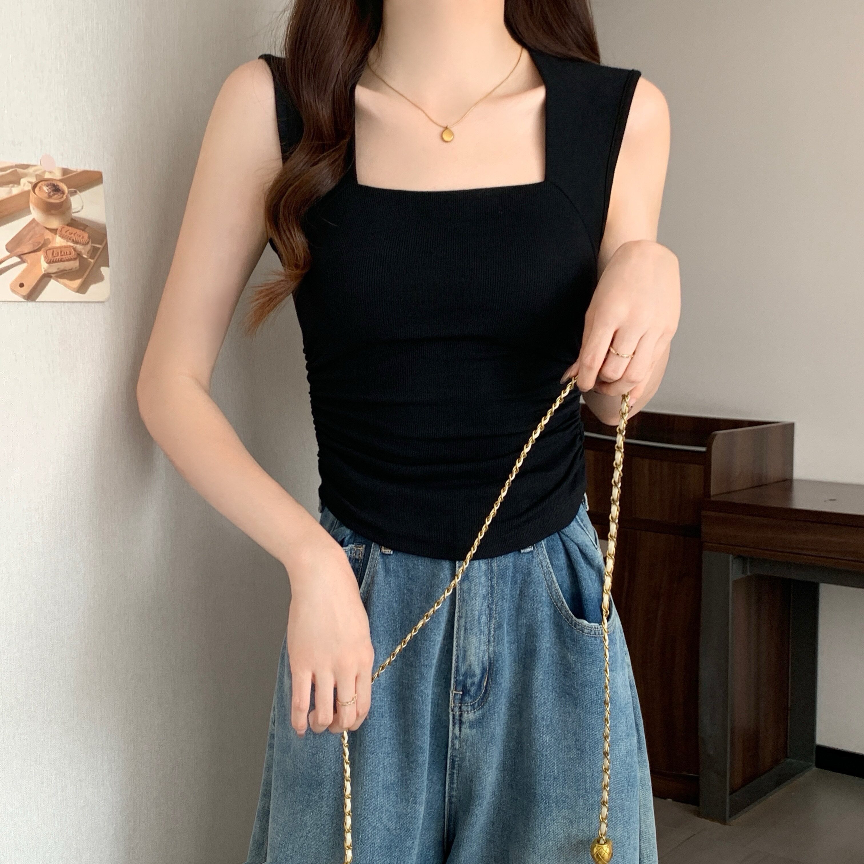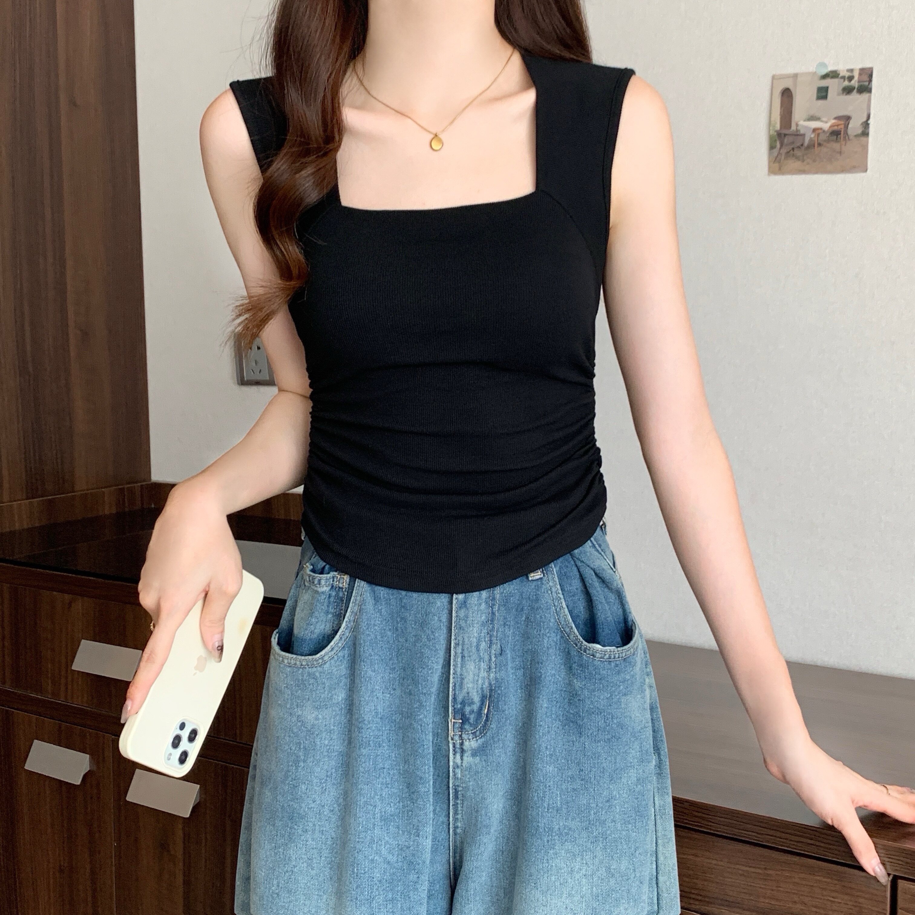 Летняя дизайнерская майка топ, топ с чашечками, большой размер, квадратный вырез, тренд сезона