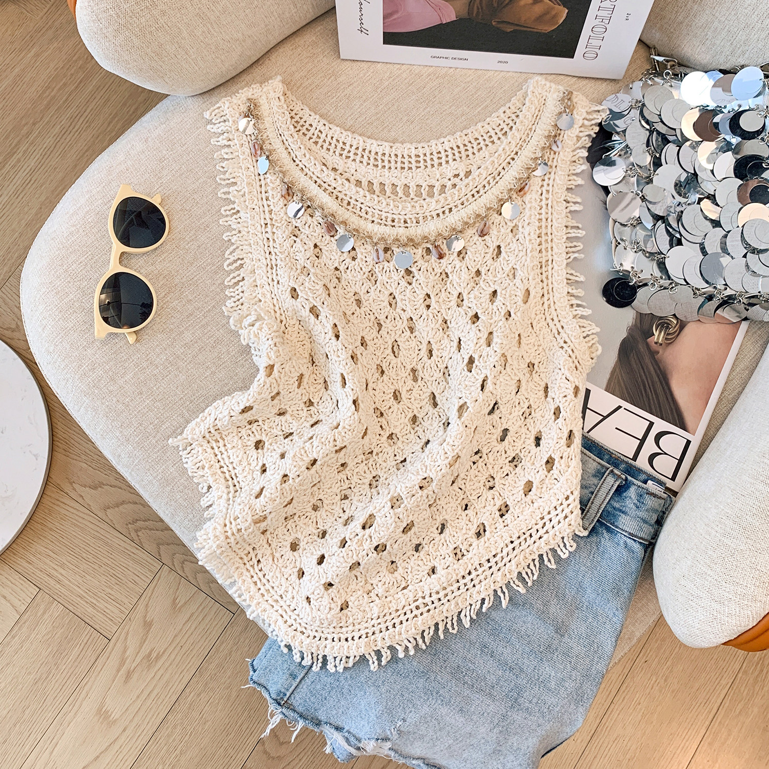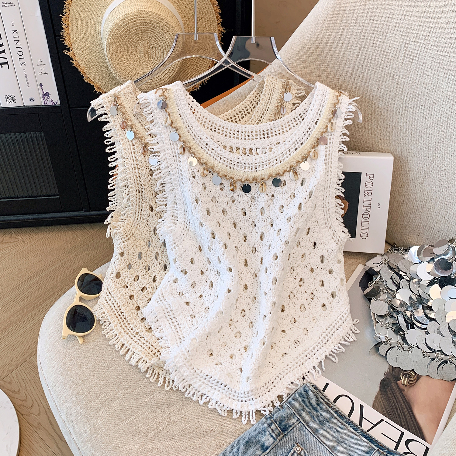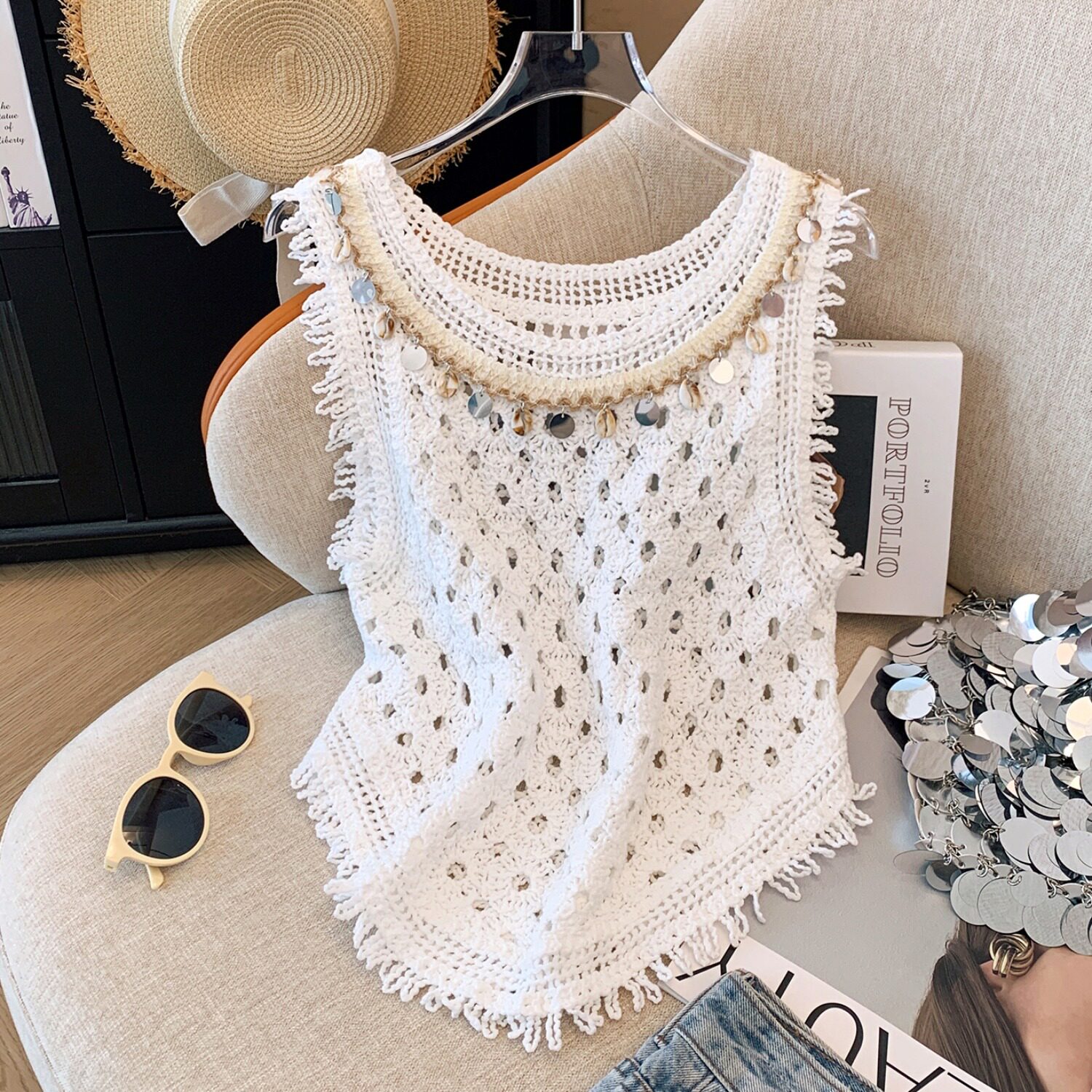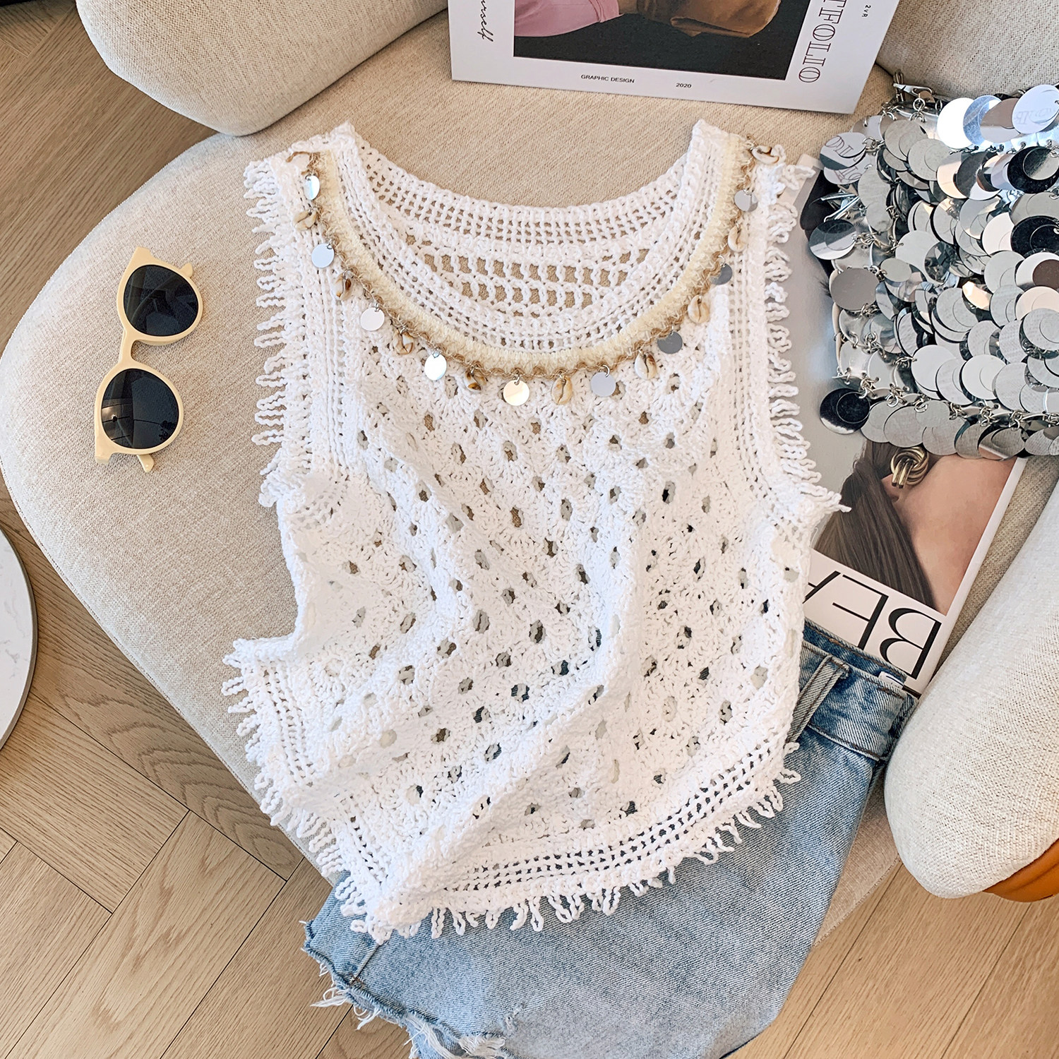 Ретро кружевная трикотажная майка топ без рукавов с круглым воротником, стиль бохо