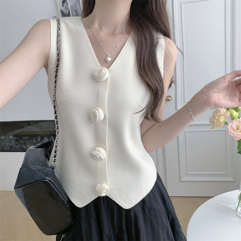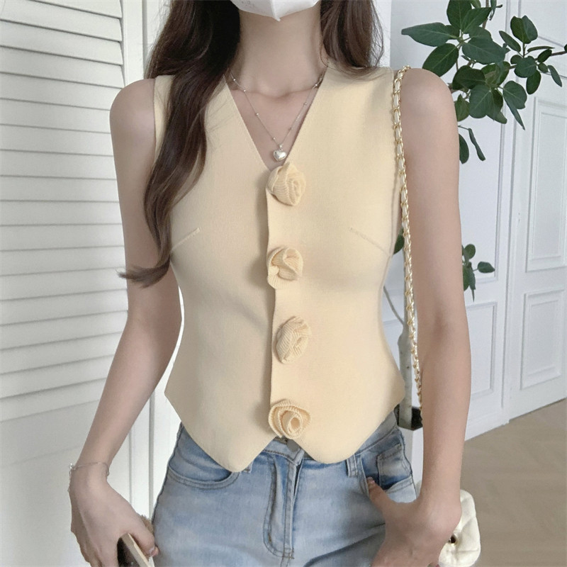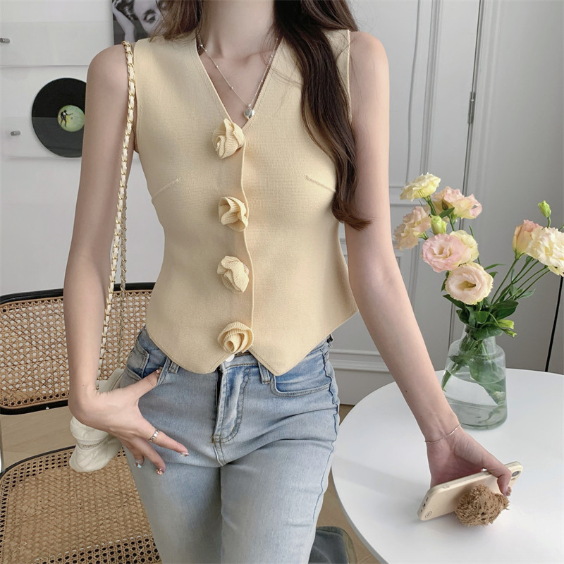 Трехмерный трикотажный жилет без рукавов, дизайнерская майка топ, французский стиль, в цветочек, тренд сезона, облегающий крой, V-образный вырез