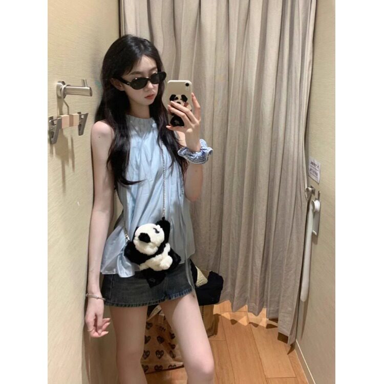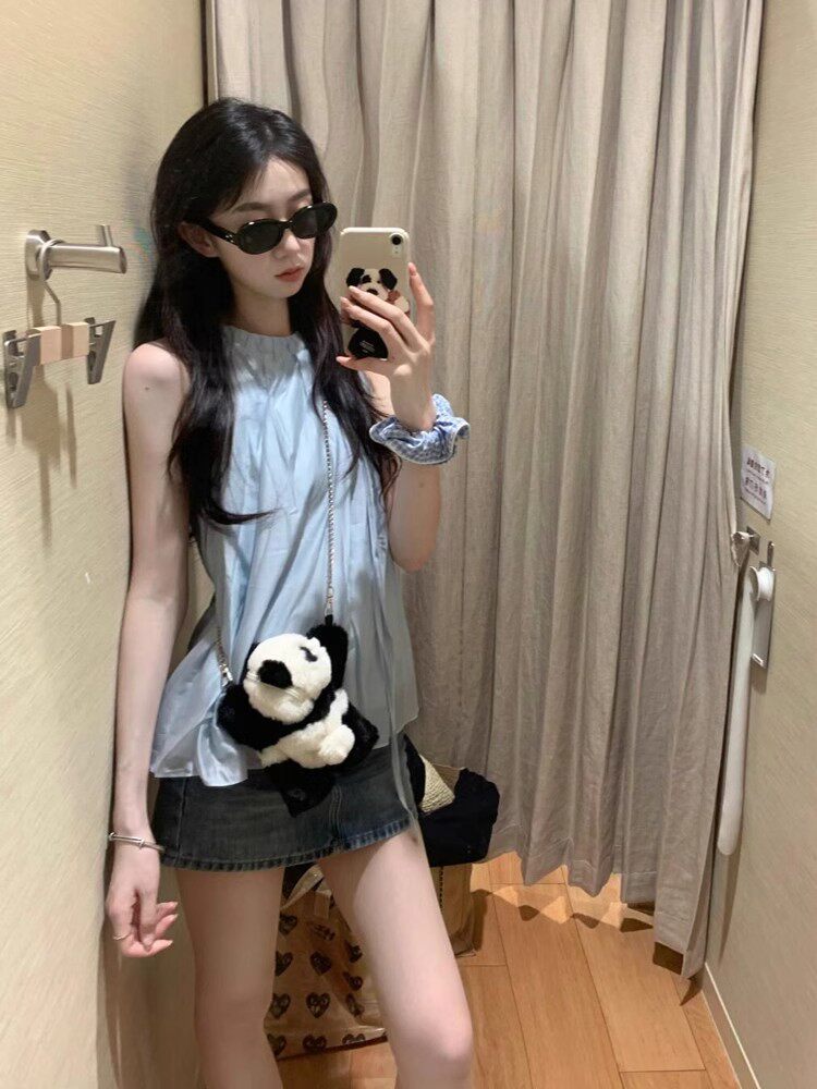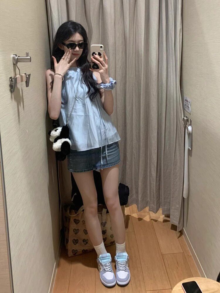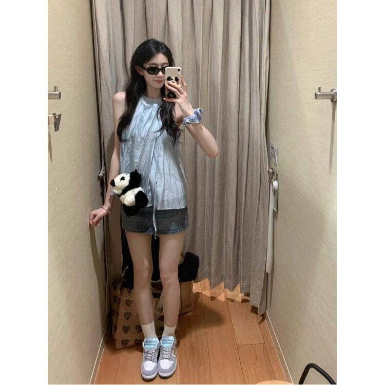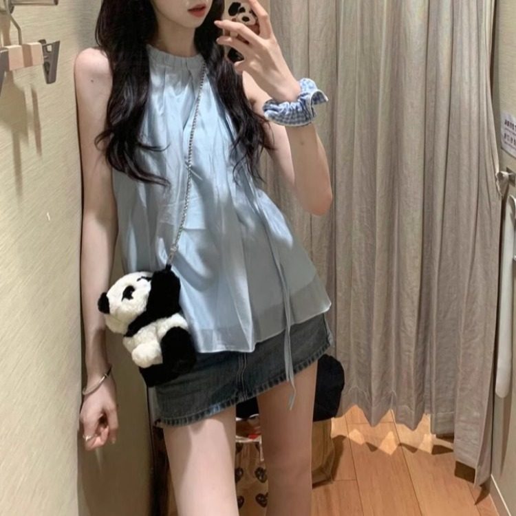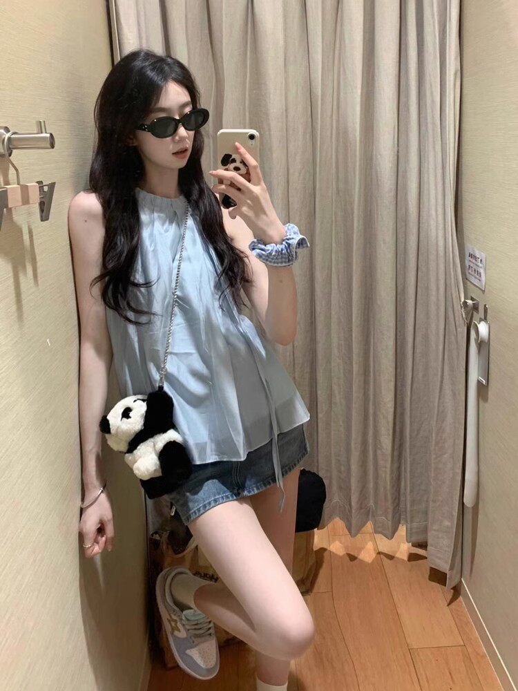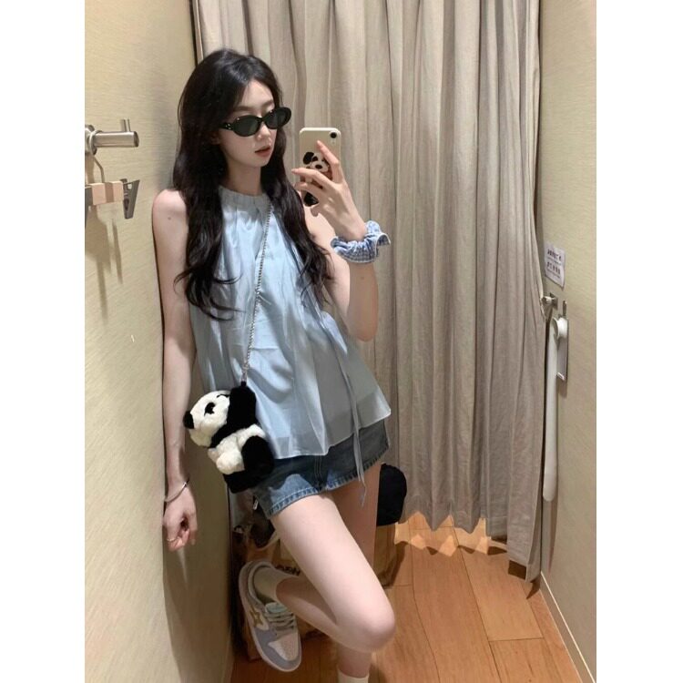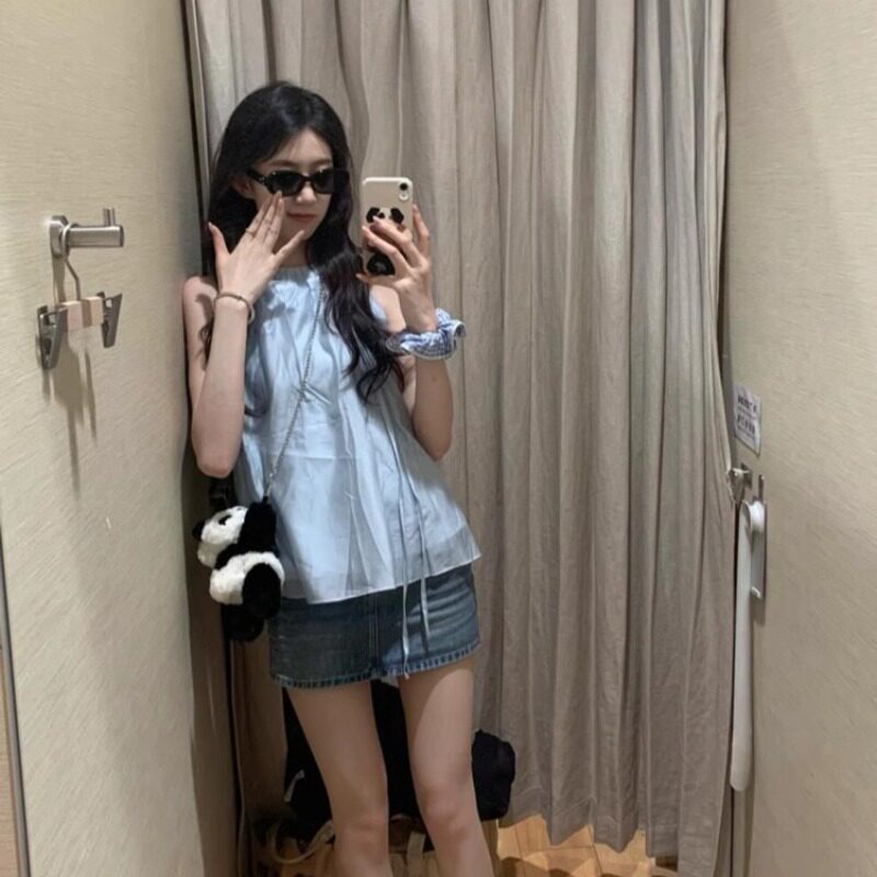 Синий милый топ с чашечками, шифоновая кукла без рукавов, французский стиль, изысканный стиль