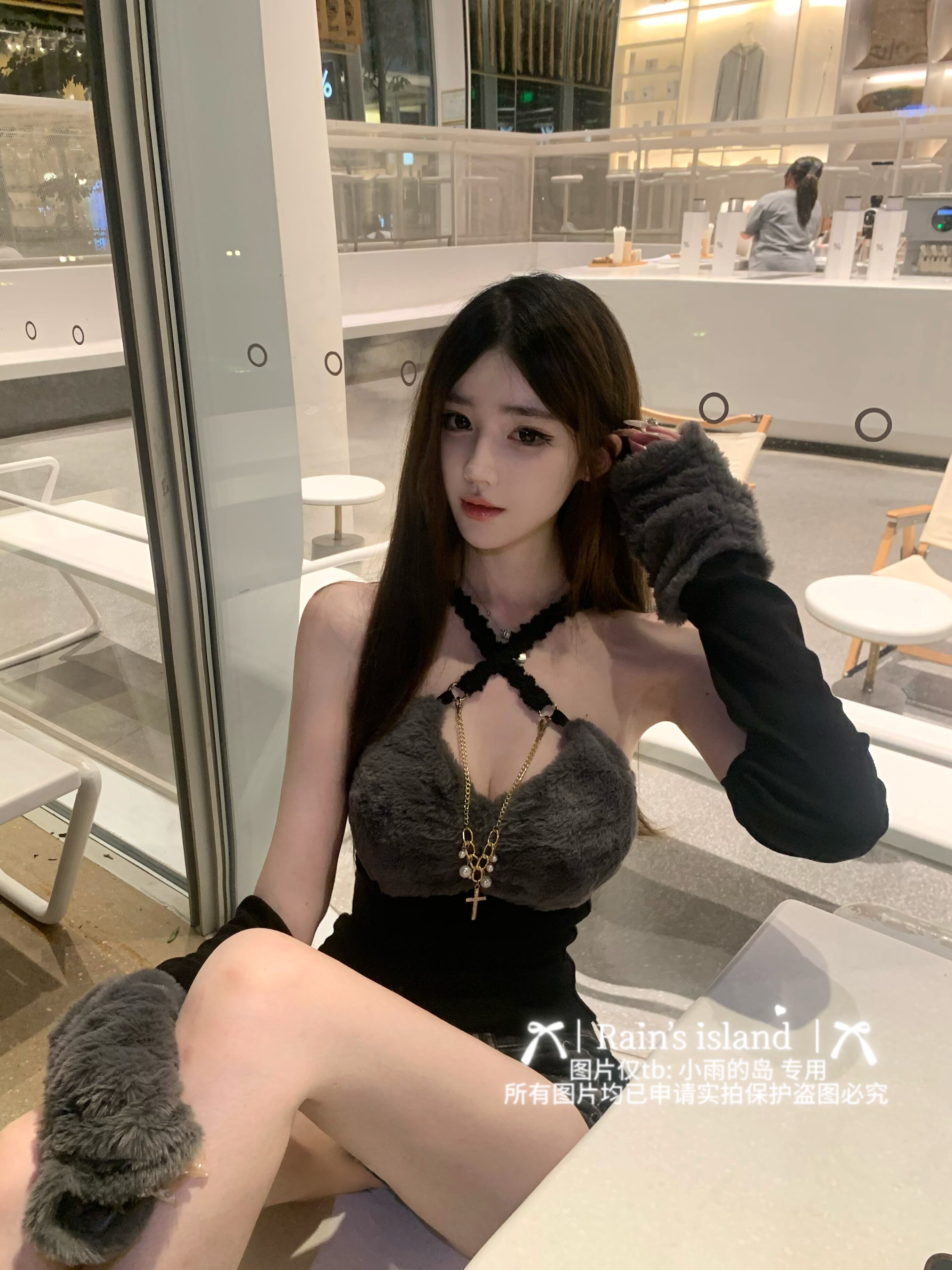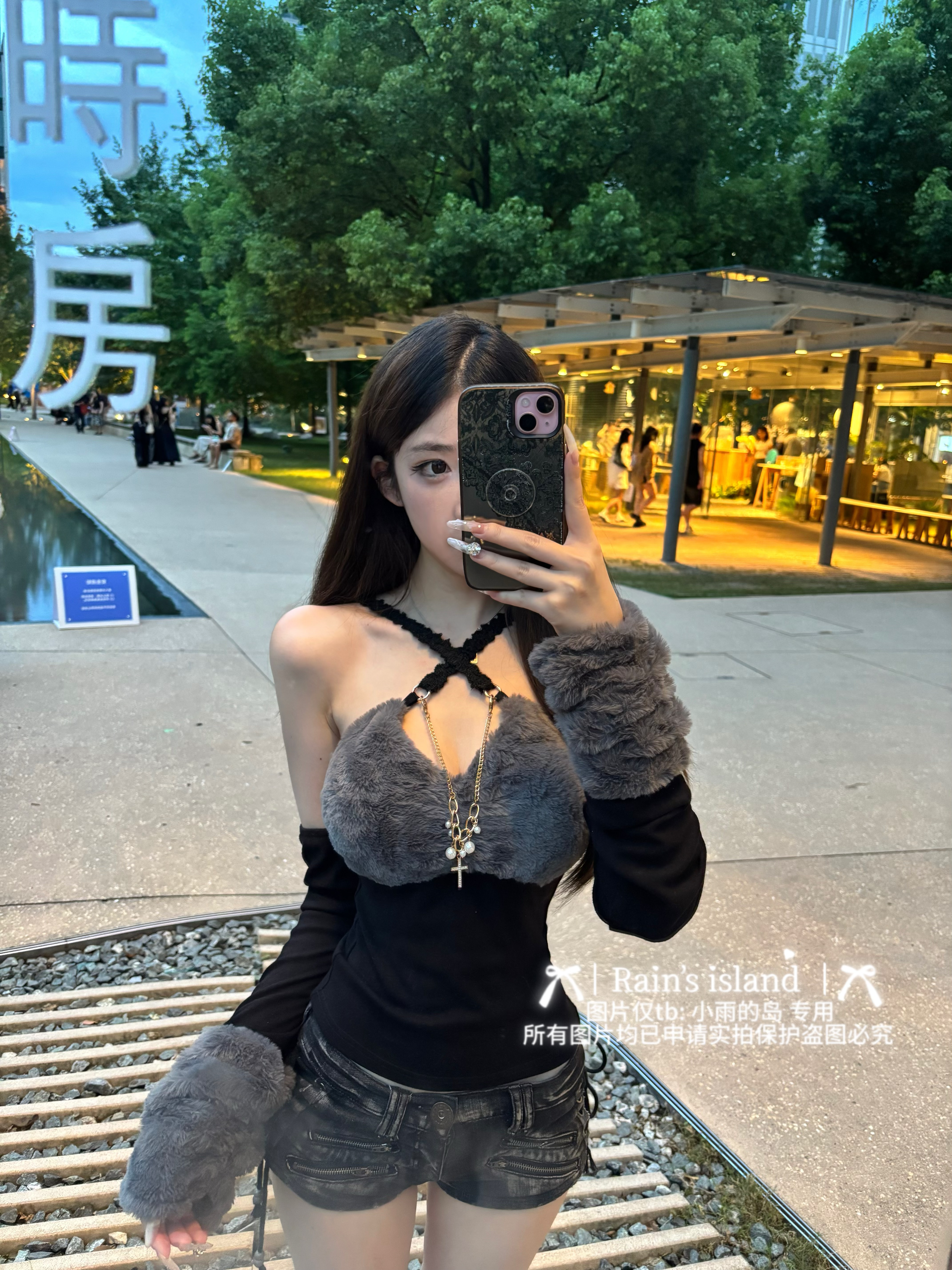 [Остров Сяо Юя] черный и розовый меховой топ с перекрестными ремешками в стиле d.i.a + рукава