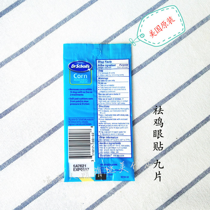 DR SCHOLL'S CORN REMOVERS Спецификация: 9 сообщений Активный ингредиент: 40%салициловая кислота Другие ингредиенты: антиоксиданты, оксиды железа, минеральное масло, нефтяная смола, диоксид кремния, синтетический полибкотеновый резина, порошок талька Эффективность: решить мозоли, курица Ян Ян Теплое напоминание: только для внешнего использования; Если вы пациент или человек с плохим кровообращением, пожалуйста, не используйте этот продукт; Не применяйте его на какую -либо зараженную или красную кожу; Если у вас есть какой -либо дискомфорт после использования, остановите его. Как использовать: вымойте пораженную область и высушите ее полотенцем.Поместите защитный круг в курицу Ян, и лента может быть зафиксирована в соответствии с фактической ситуацией.Меняются каждые 24-48 часов, не менее 14 дней доЦыпленок ЯнЭто устраняется (пропитана теплой водой в течение 10 минут перед использованием).