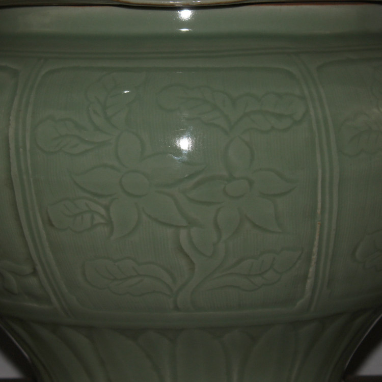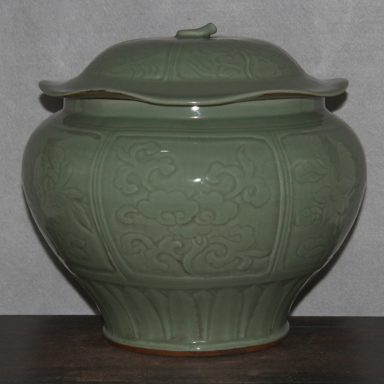 Название продукта: Большой кувшин с цветами, фруктами и листьями лотоса, вырезанный из печи Лунцюань времен династии Сун.