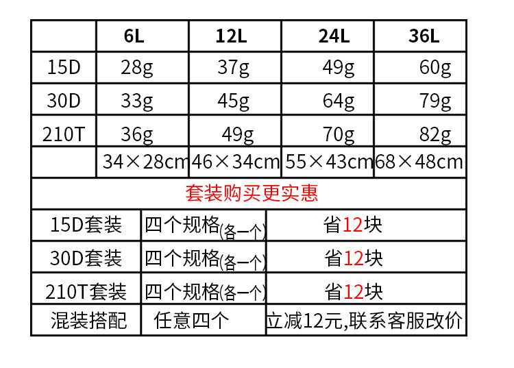 - Набор политрольной ткани 210T (6L+12L+24L+36L каждый, случайный цвет)