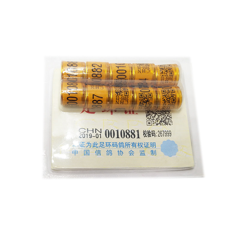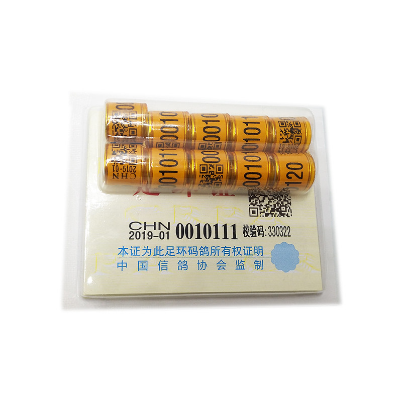 Стиль кольца голубей: «CHN2019-01-888888», «CHN»-это английская аббревиатура Китая «2019»-это год рождения этого голубя. От имени Ассоциации Пекинского голубя «02» представляет Ассоциацию голубя Тяньцзин и зарегистрированное кольцо голубя следуют.Спецификации единого кольца ног в стране: