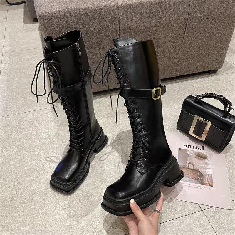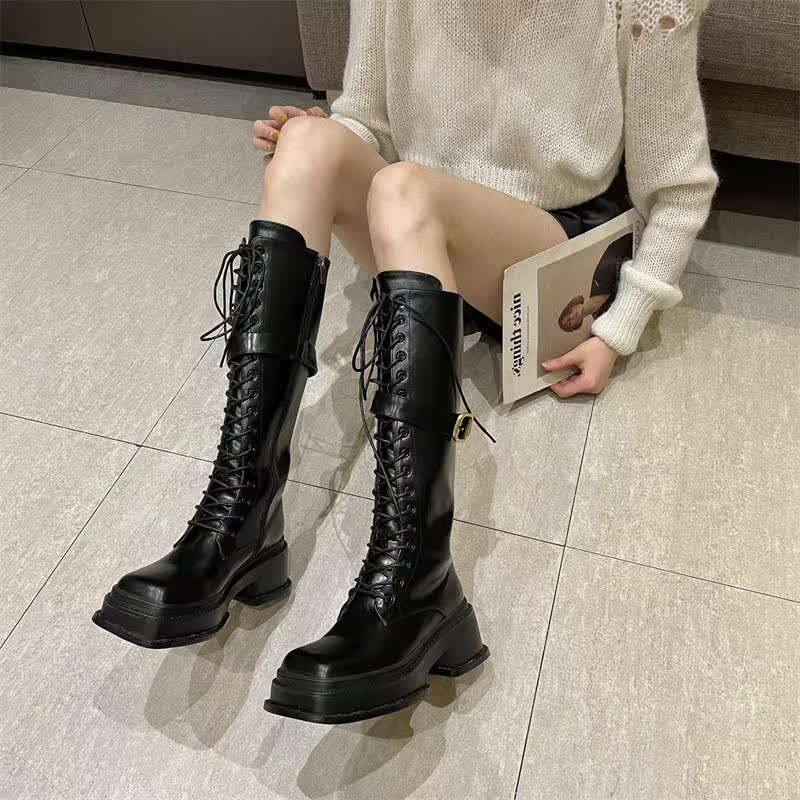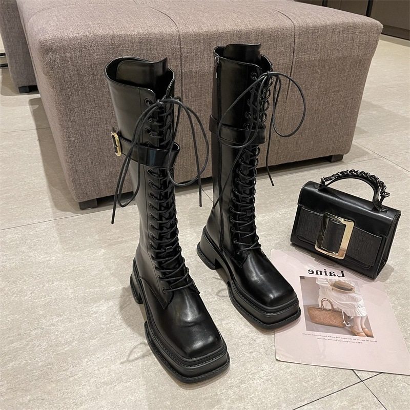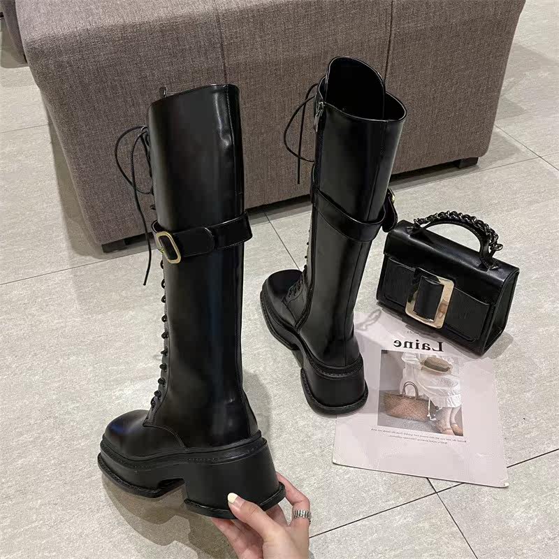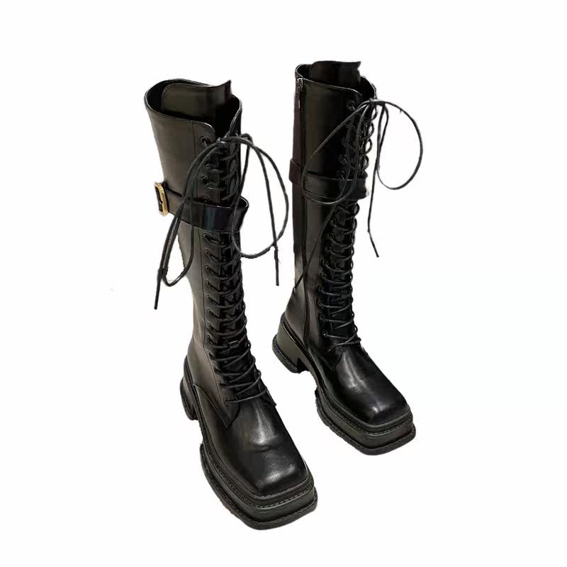 Little Ckerwin Design Black Leather Cubes Строка Knights Xue Women's Wide Zippens Long Cylinder xue