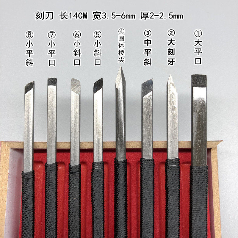 [Материал]: весь корпус ножа изготовлен из высокоуглеродистой марганцевой стали (широко известной как тонкая сталь, пружинная сталь), а ручная часть обернута шелковыми веревками для 8 разделочных ножей разных размеров. Он подходит для любителей резьбы по печатям и может использоваться для гравировки и чистки монет.