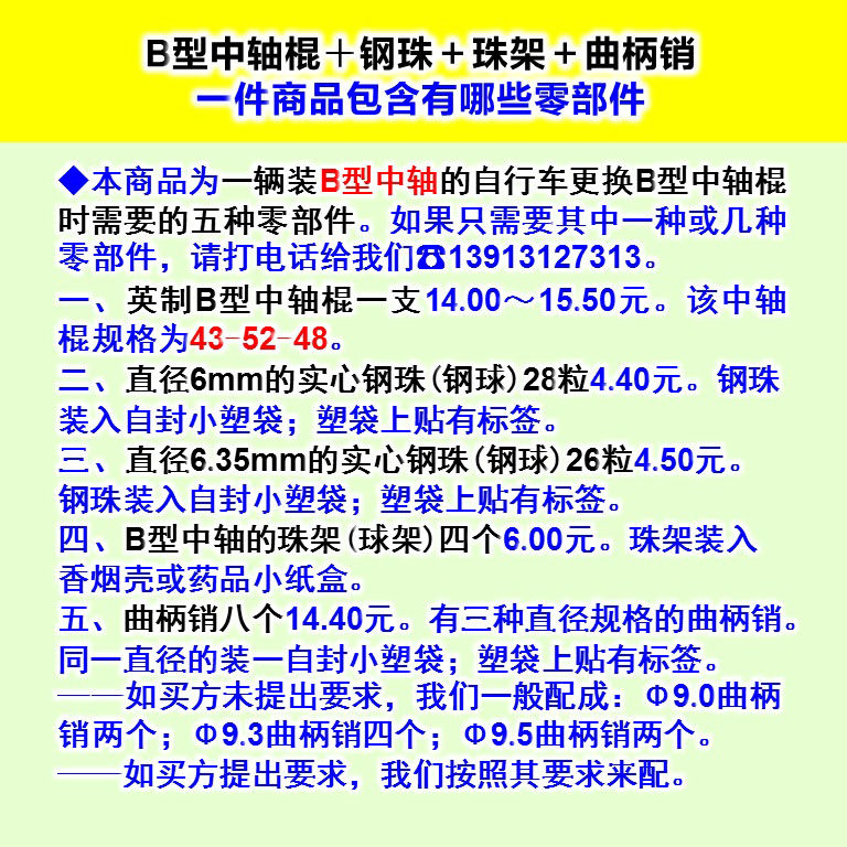 【Введение продукта 1】Этот продукт представляет собой компонент каретки типа B (палка каретки типа B + стальной шарик + бортовая рама + шатунный штифт) для старомодного 28-дюймового сверхмощного велосипеда FOREVER;Совершенно новый. Подробную информацию об этом продукте см. в части 7.