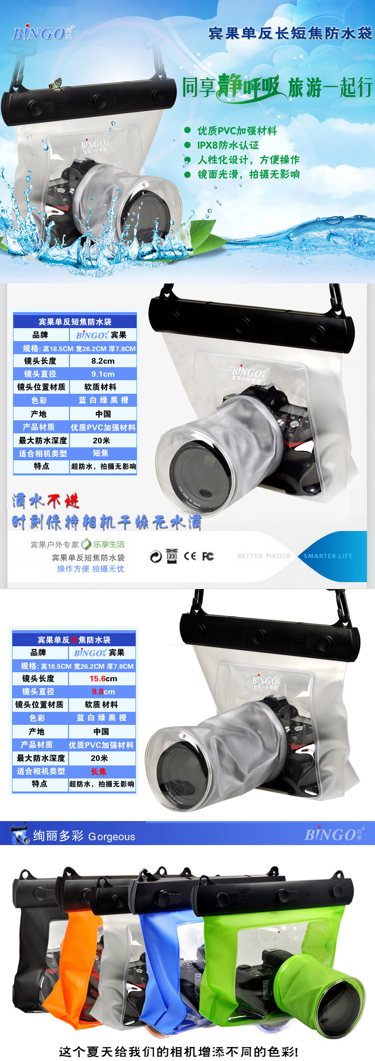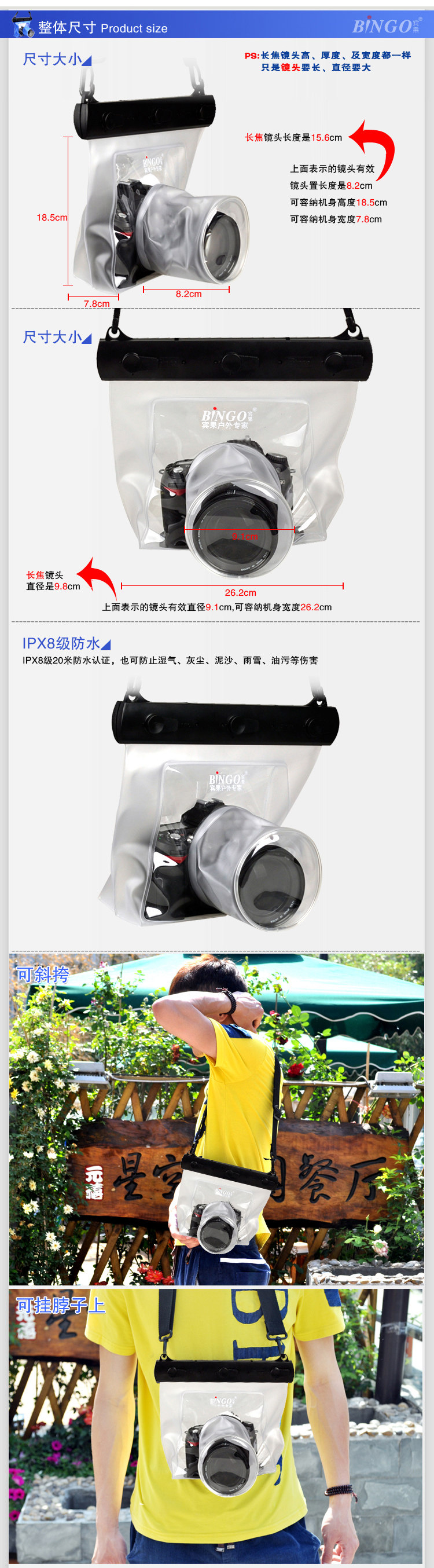 После тестирования этот водонепроницаемый рукав бинго может достигать хорошего состояния защиты глубиной 20 метров. Этот продукт предназначен для разработки мобильных телефонов/камер от воды, снега, дождя, ветра и песка, пыли и цветущих повреждений. Конечно, бинго также может быть Применяется к бассейнам, водным паркам, водным занятиям, приморью, реке, но наша гарантия достигает всего 30 метров глубиной воды, потому что дизайн некоторых мобильных телефонов/камер не подходит для слишком глубокой воды (потому что давление воды - это давление воды (потому что потому что Давление воды - это давление воды, проблема).Бинго - это новейшая водонепроницаемая крышка для мобильного телефона/камеры, пыльно -защищенная, водонепроницаемая, ветрозащитная песок, дождь и снег, подходящий для наружного, пляжного, бассейнов, мелководье и подводной камеры. Камера полностью защищена и может наслаждаться весельем в Вода. Это необходимое стандартное оборудование для спорта на открытом воздухе. Этот продукт может подходить для большинства моделей различных основных брендов/камер на рынке.