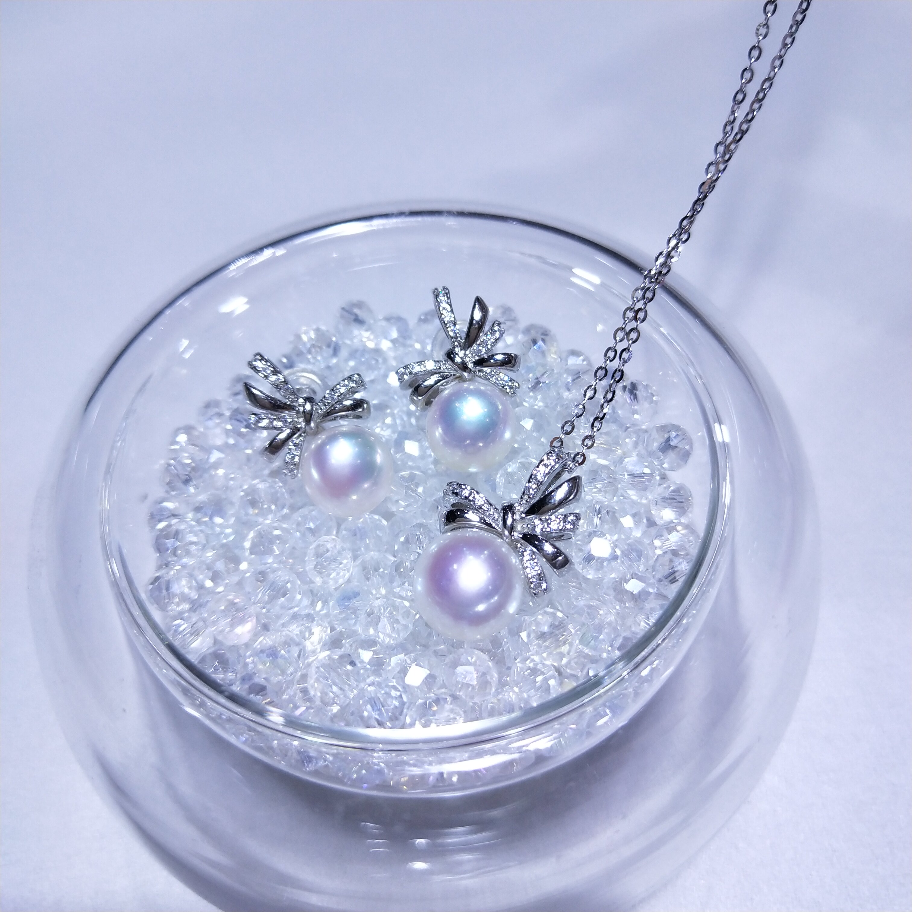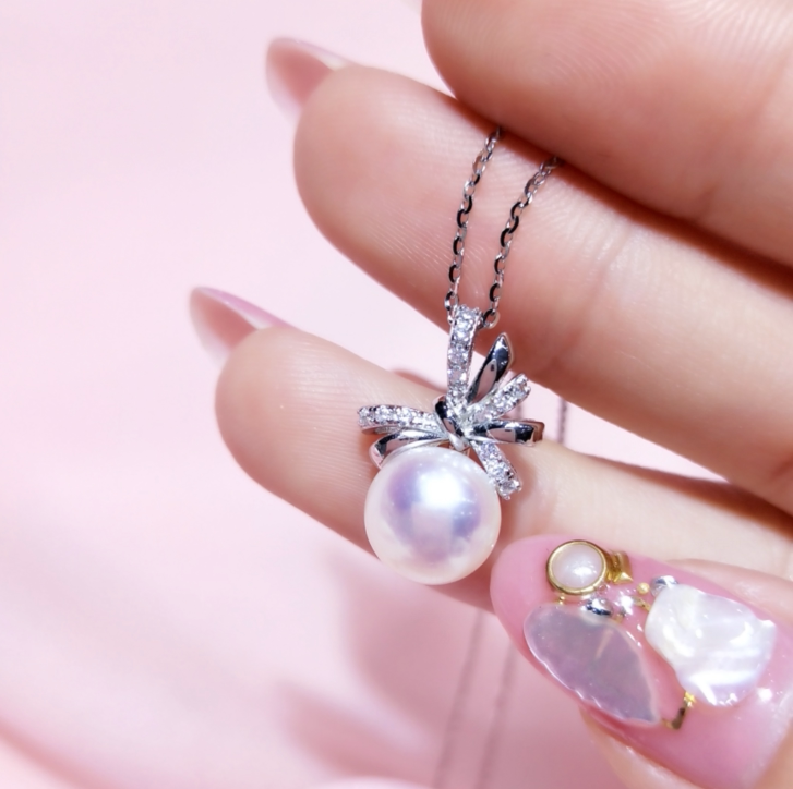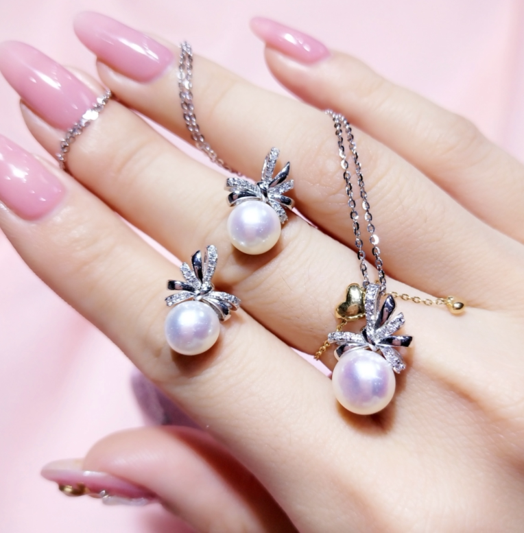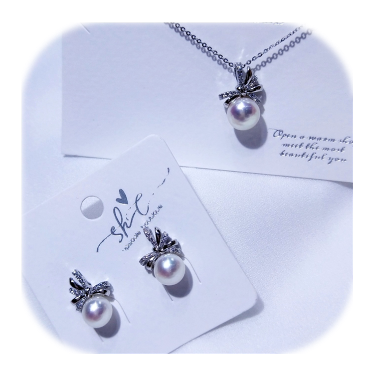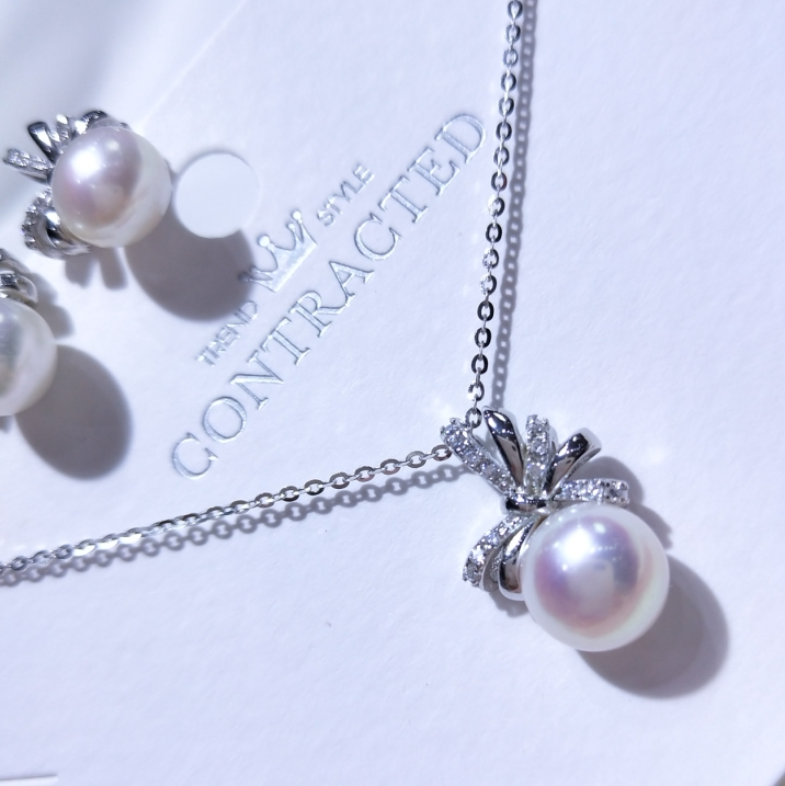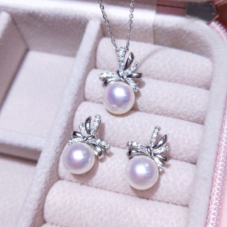 Японский натуральный комплект с бантиком, серьги из жемчуга, подвеска, ожерелье, серебро 925 пробы