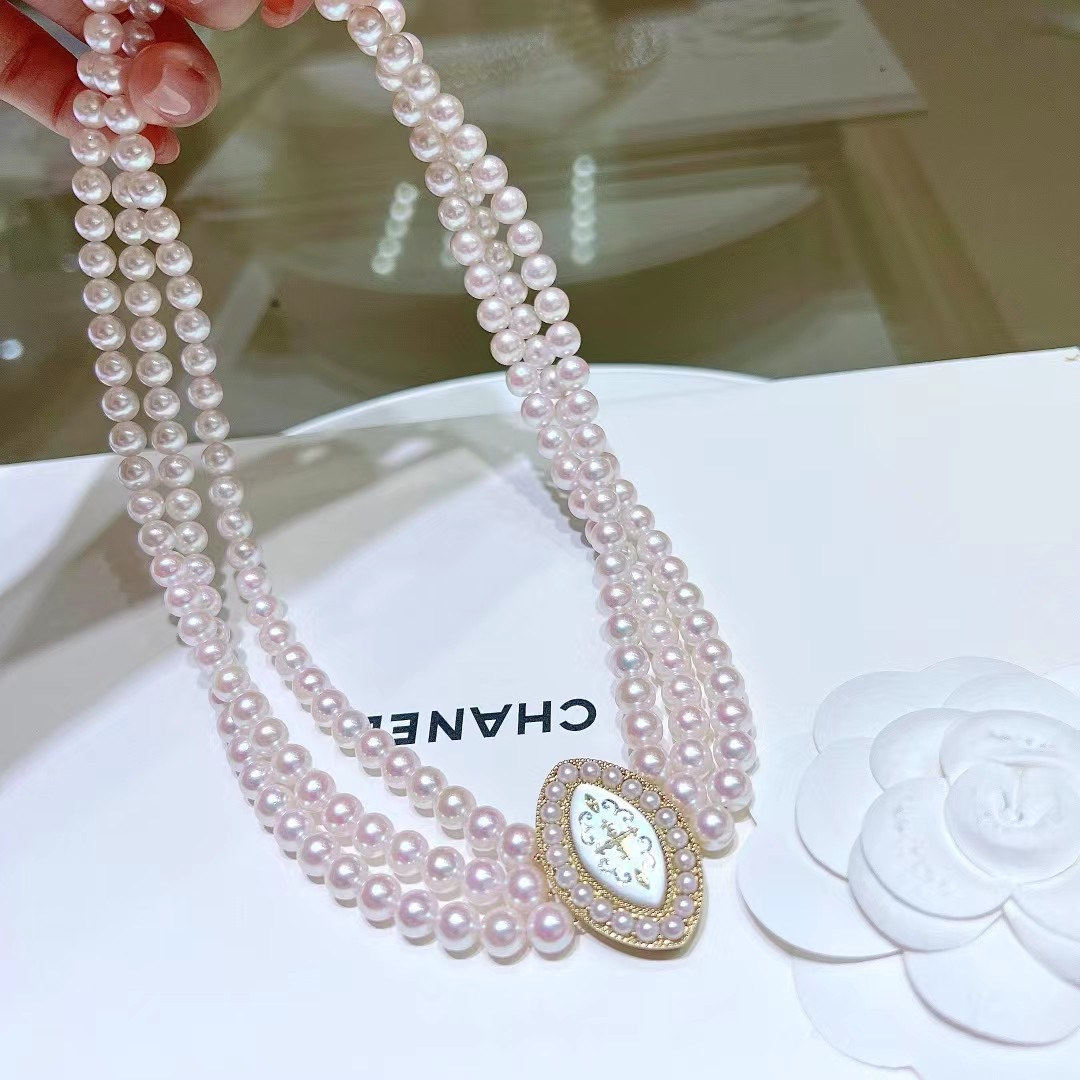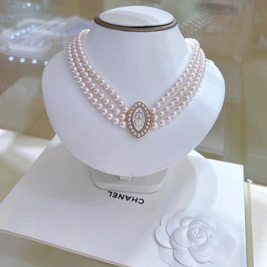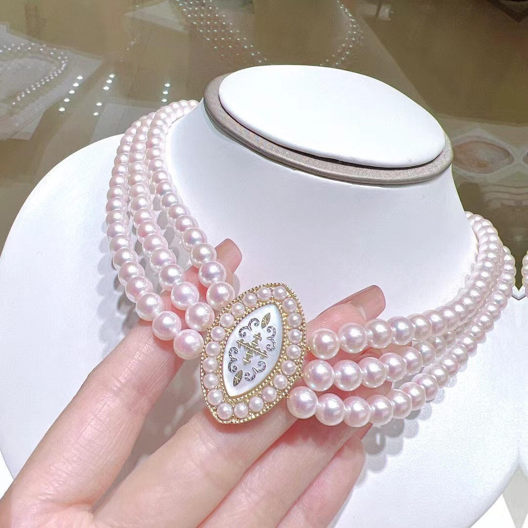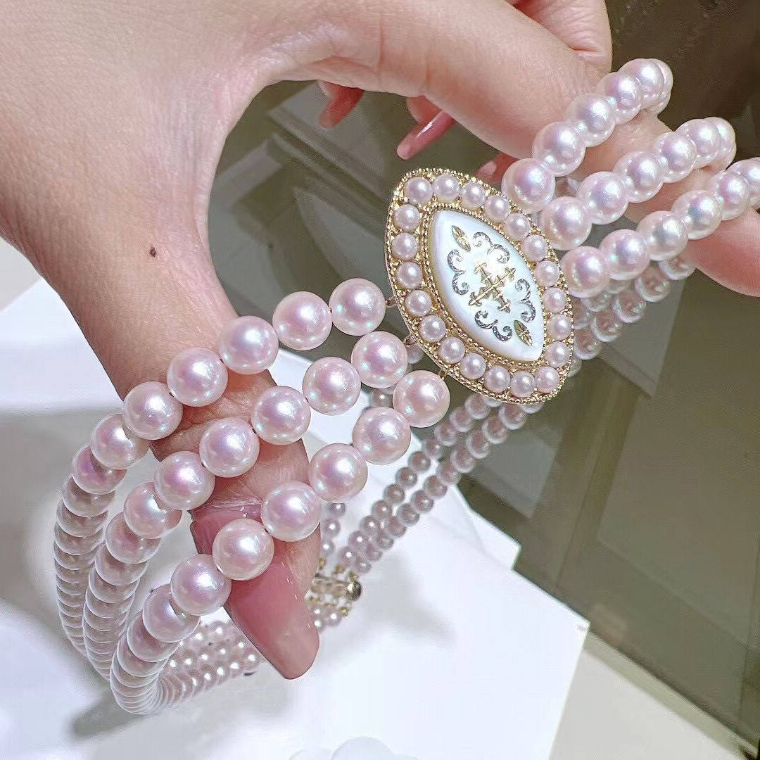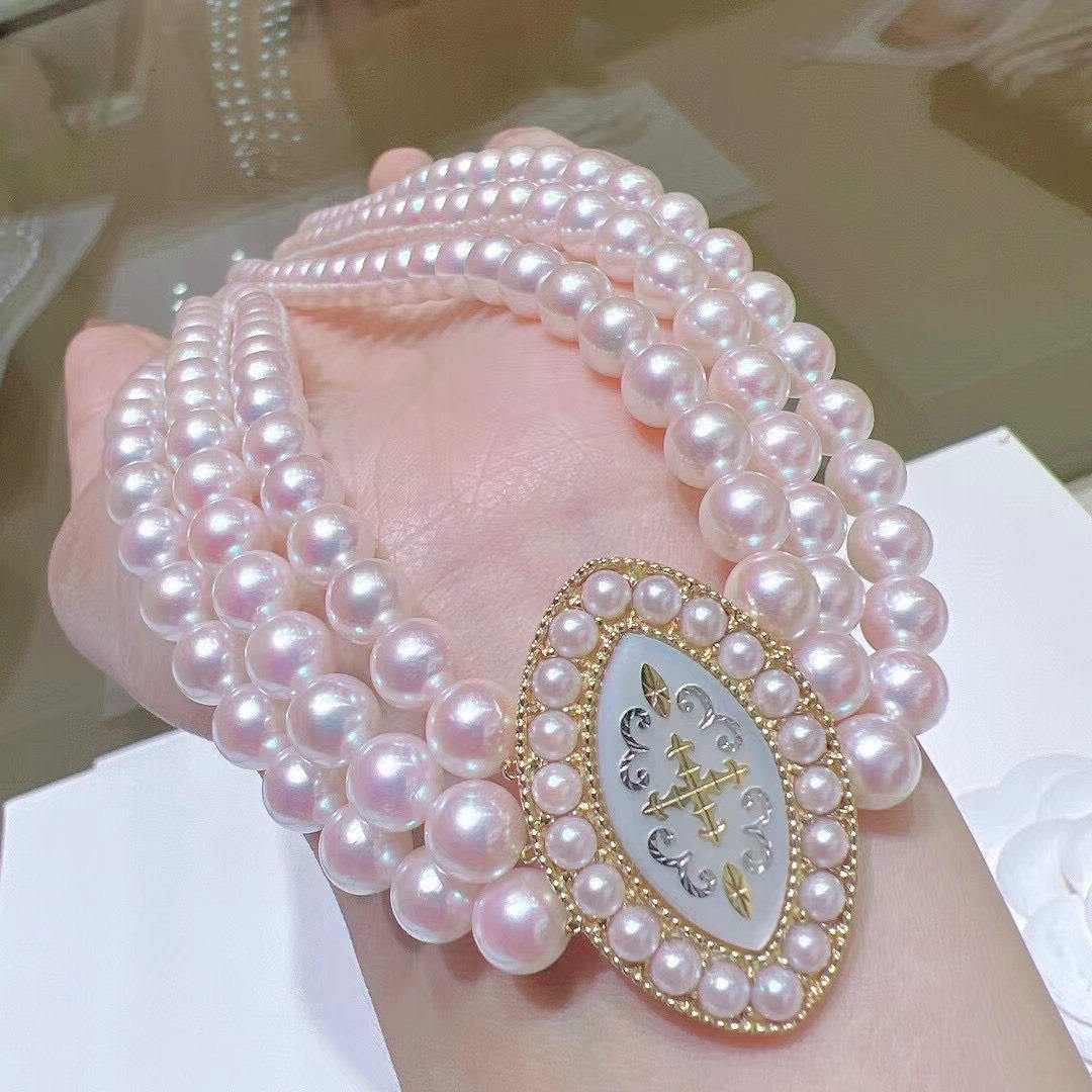 Японское трехслойное колье-колье в классическом стиле 6-6,5 мм, идеальное круглое, сильное, легкое, с небольшими дефектами, пряжка из перламутра 18 карат