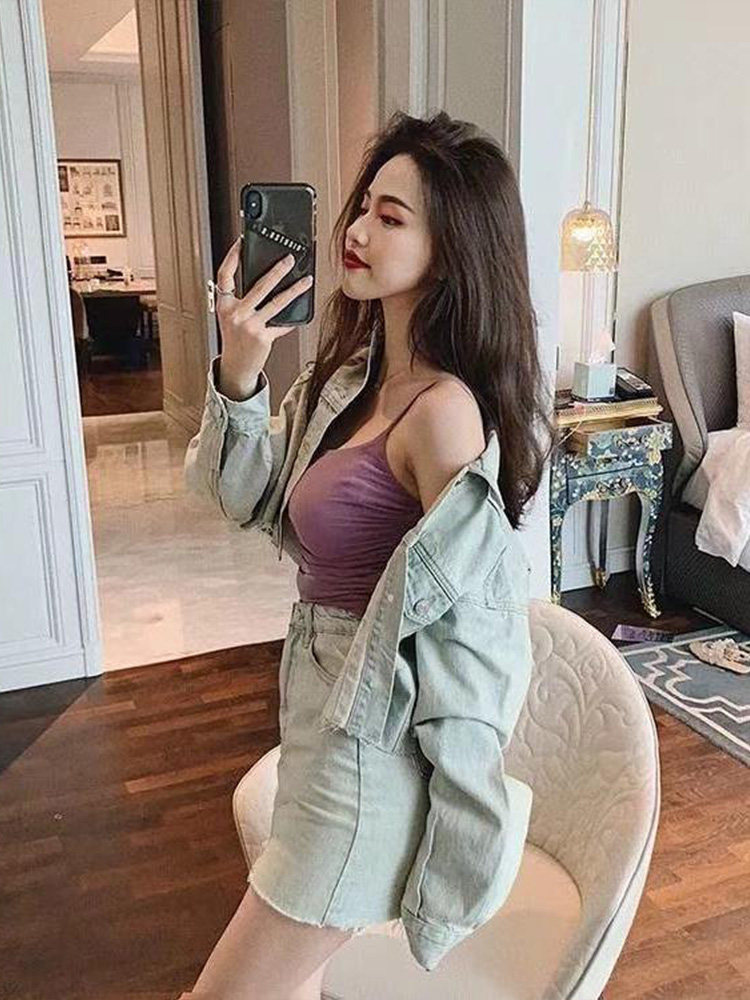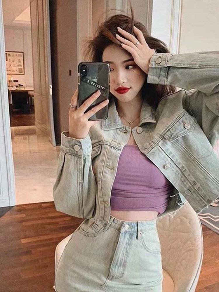 Осенняя ретро джинсовая куртка, мини-юбка, комплект, 2020 года, в западном стиле