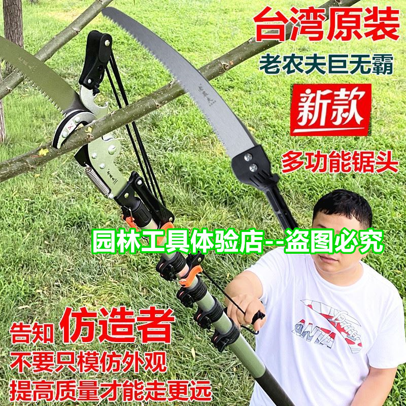 Импортные ветеранские фермеры, высокие ветви вырезают садовые художественные фруктовые деревья, распиливающие высокие вытягивания ветви