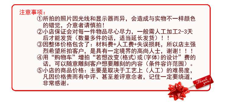 Note: ※ 1. Цена содержит стоимость скульптуры. Для бесплатных шаблонов резьбы, пожалуйста, обратитесь к следующему значке ниже (нажмите ниже‘Формат сообщения’После замечаний разместите заказ напрямую, не нужно связываться с обслуживанием клиентов). ※ 2. Если вам нужно изменить резьбу‘Формат, содержание, шрифт’Если вы используете [дополнительную плату за дизайн] с корзиной покупок, свяжитесь с обслуживанием клиентов. ※ 3. Если вы покупаете несколько одновременно, обратите внимание на различные резьбы в соответствии с различными акриловыми цветами, спасибо. ※ 4. Несмотря на то, что он сфотографируется таковым, из -за факторов браузера, используемых фотографиями, углом и клиентом при чтении, при получении товара, эффект дисплея физического дисплея и детали скульптуры будет немного другим С картины. Это нормально. Это нормально. Феномен, те, кто возражает, пожалуйста, позаботьтесь, так что следите за обновлениями. ※ 5. Этот продукт - DIY Custom Dewelry, поэтому он не поддерживает [семь дней‘Нет причин’Вернуть] Сервис!