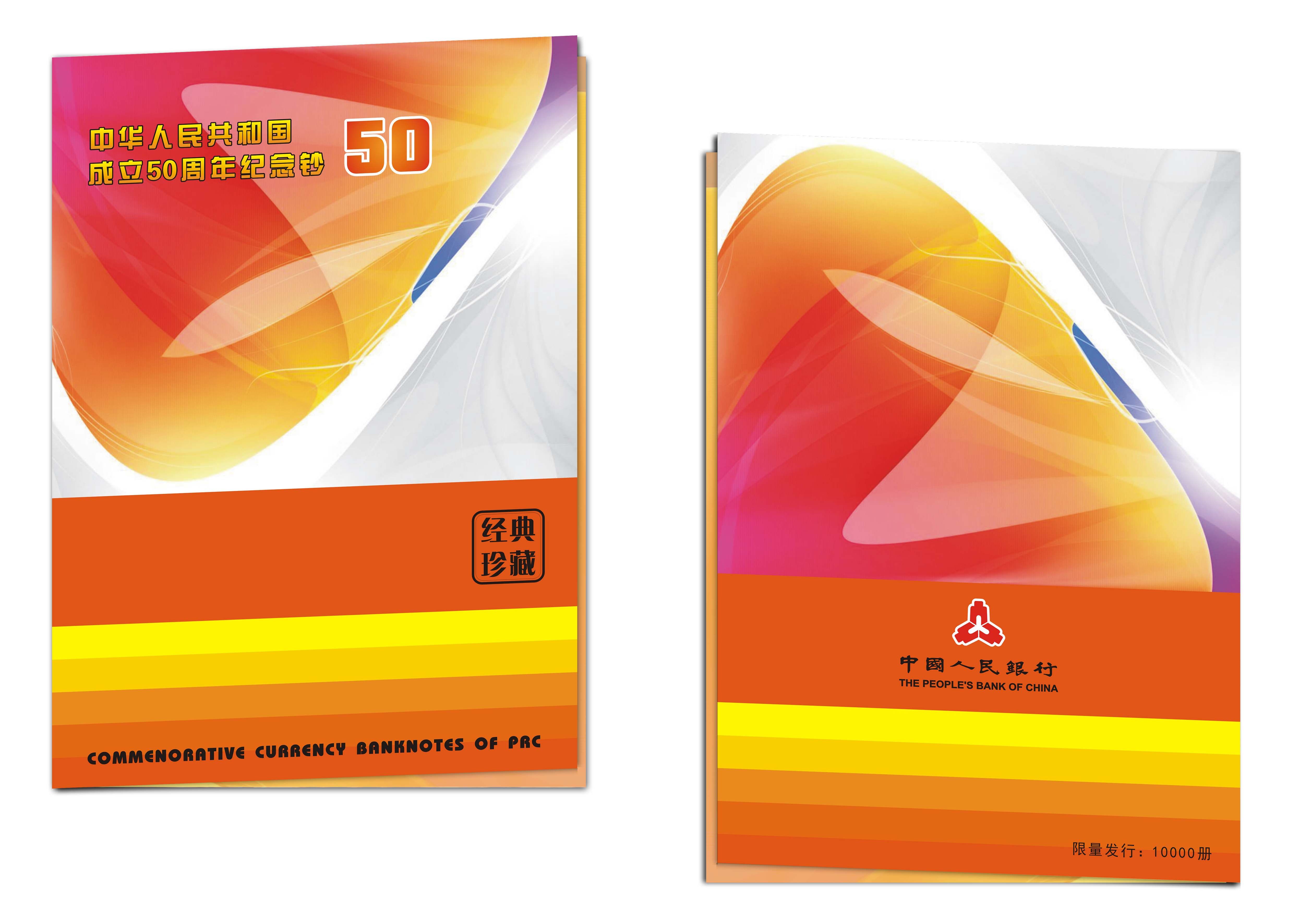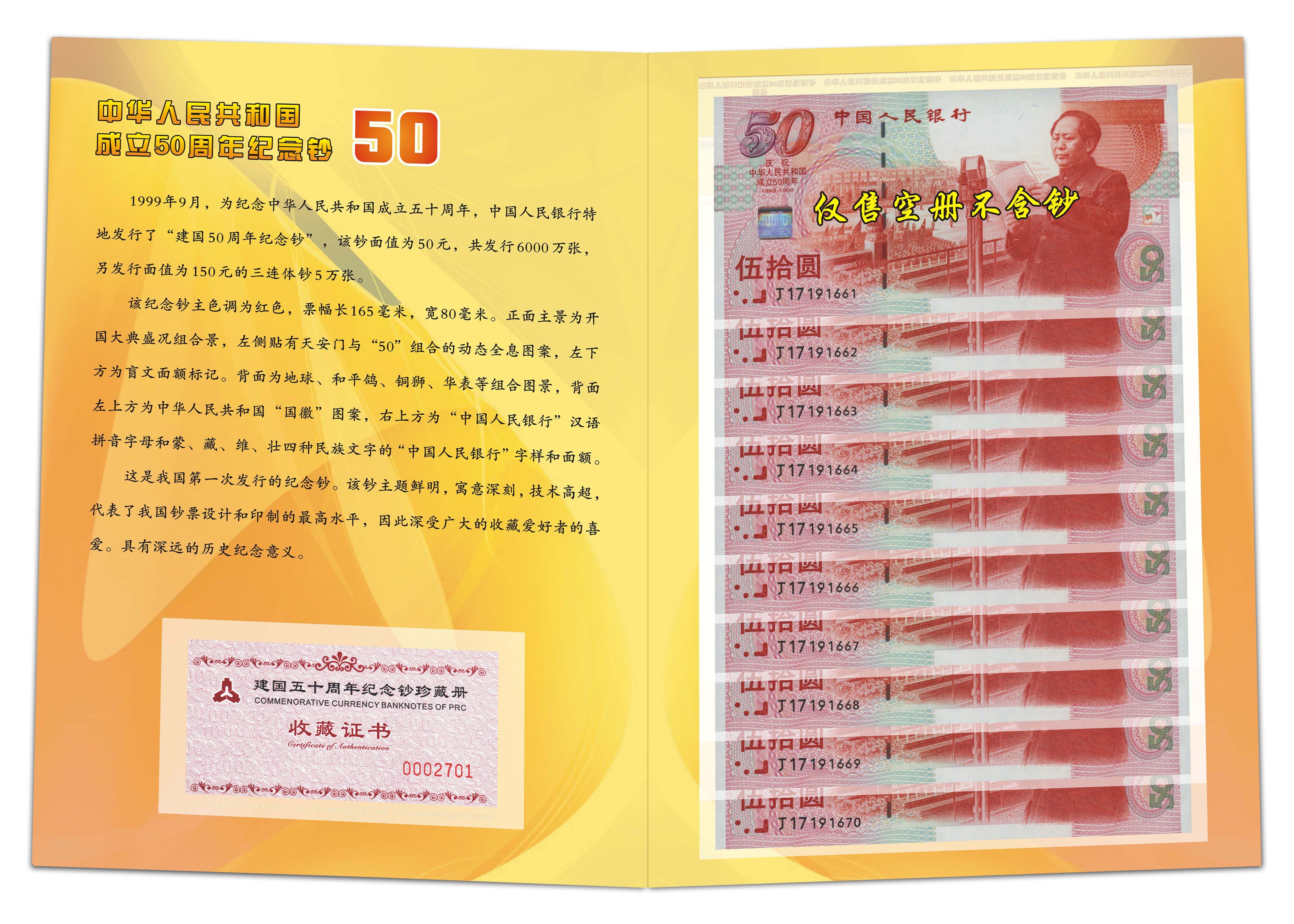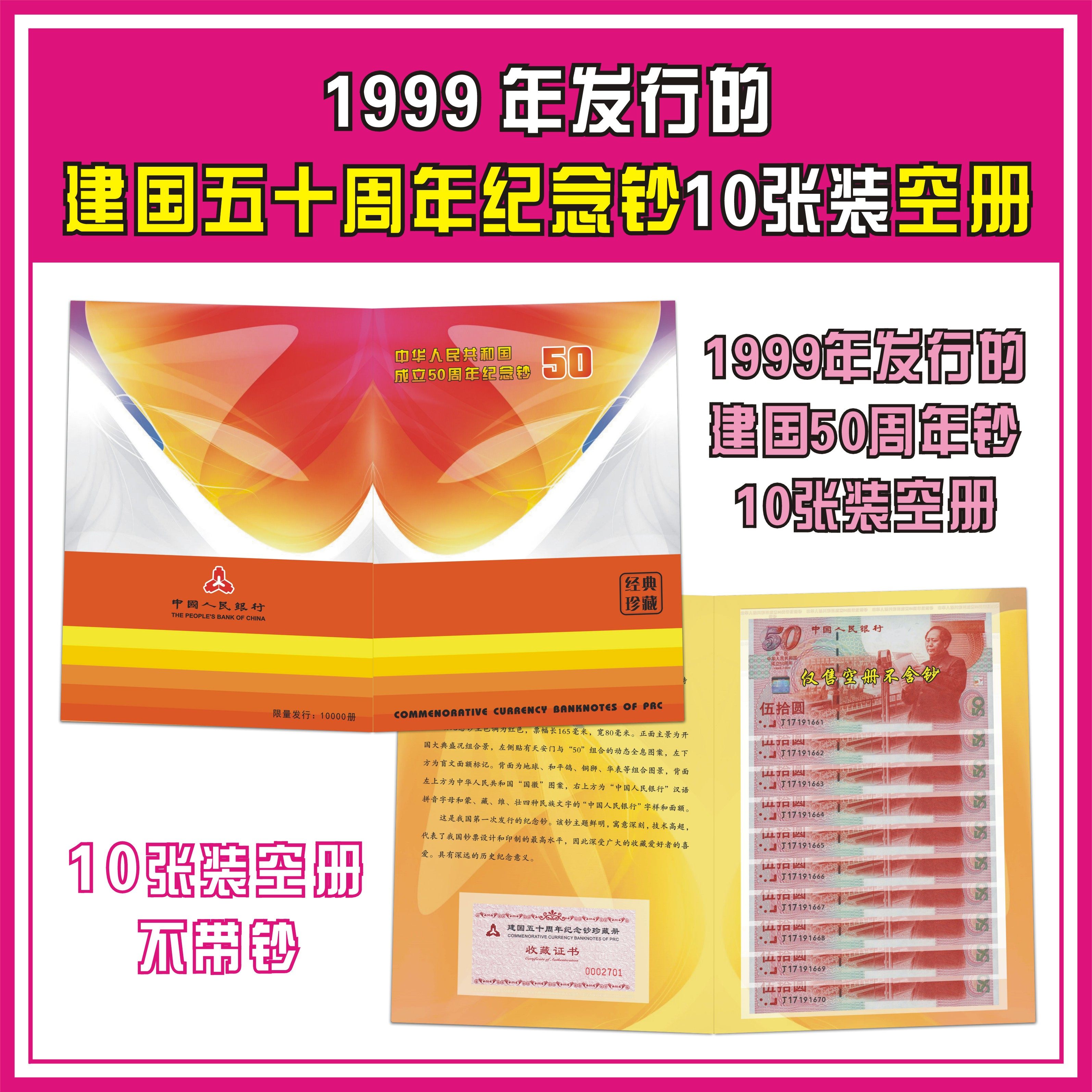 Десять кусочков пустых книг, 10 штук пятой годовщины из 50 юаней, памятной банкнот, 50 -й годовщины основания Китайской Народной Республики в 1999 году в 1999 году в 1999 году