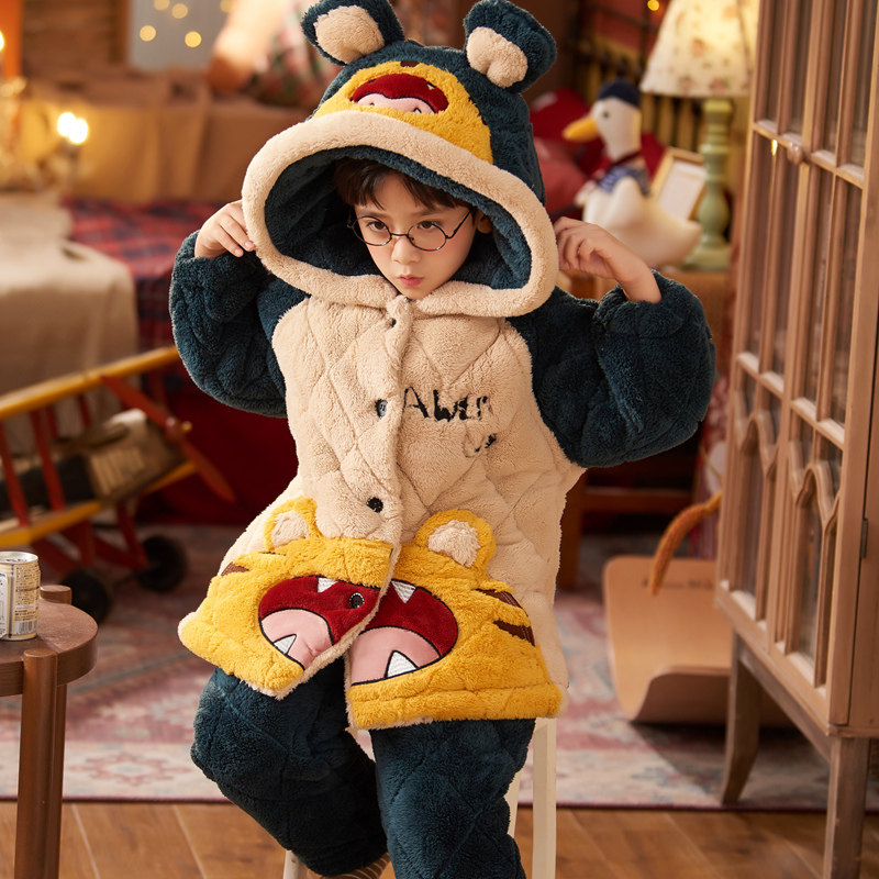 Удерживающая тепло коралловая бархатная стеганая детская зимняя пижама с капюшоном для мальчиков, подходит для подростков
