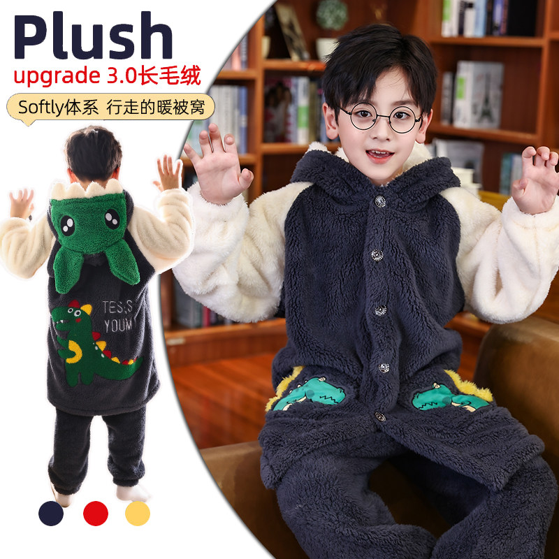 Демисезонная фланелевая пижама для мальчиков, комплект, длинный коралловый бархатный удерживающий тепло динозавр, семейный стиль, увеличенная толщина