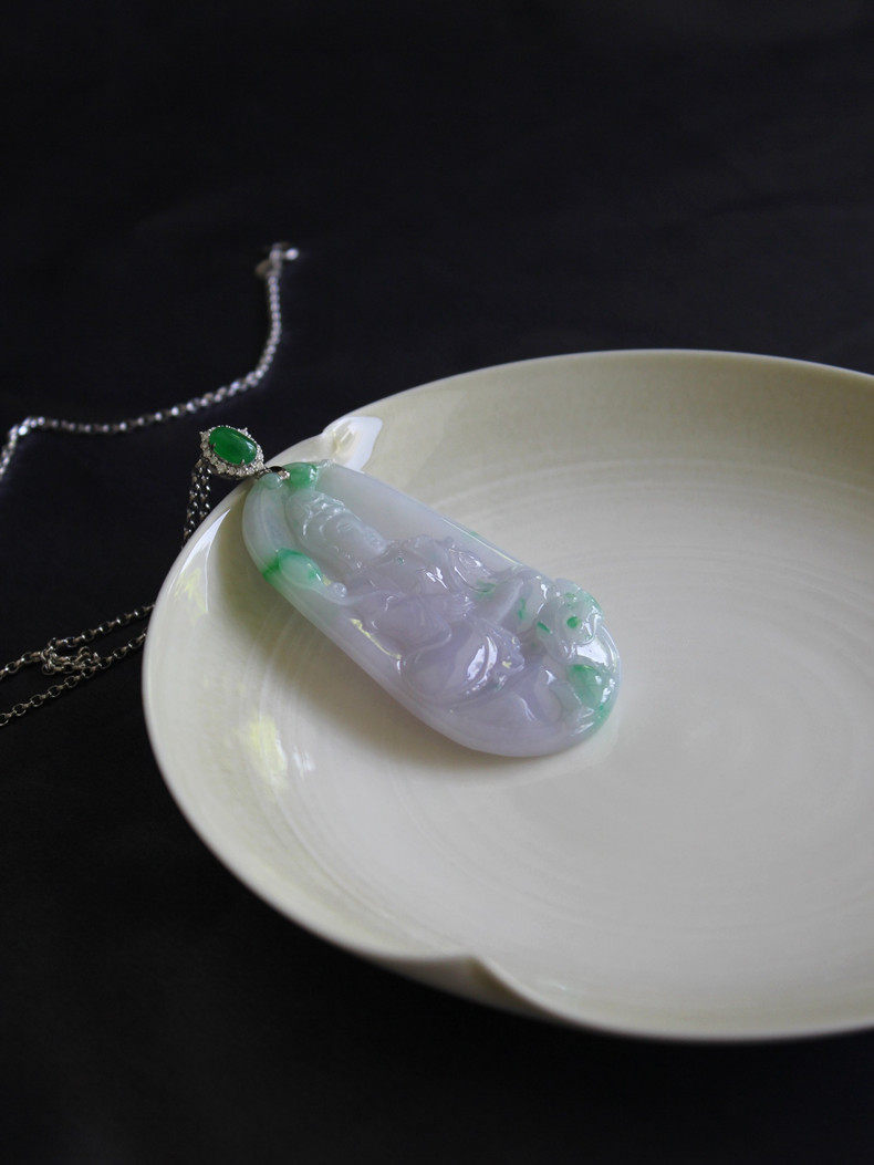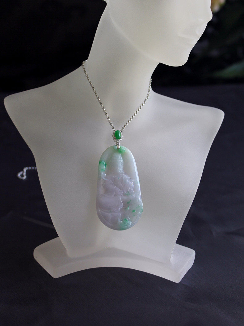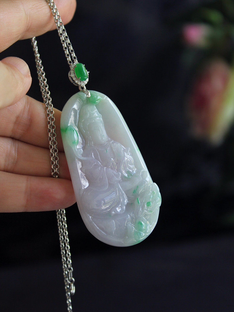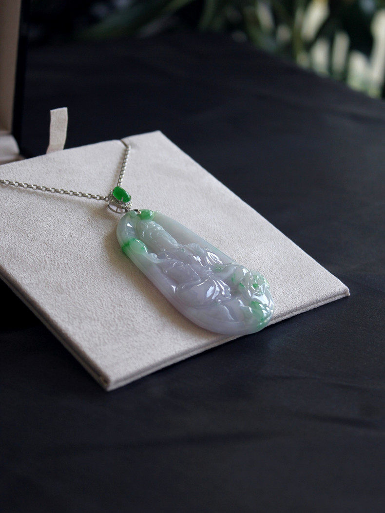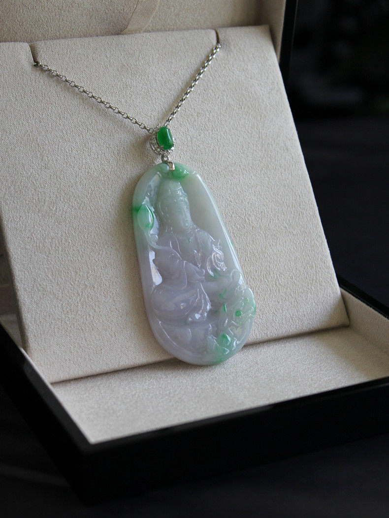 Размер весеннего цвета гуаньина составляет около 67,5x35,8x7,2 мм.Лед и восковые виды, нефрит чрезвычайно деликатный, влажный, а фоновый цвет элегантного розового фиолетового Роланд плавает со свежими сладкими и зелеными цветами, что очень элегантно.Голова представляет собой ледяную лапшу с изумрудной яичной яичкой в 7,7х5 мм, которая может привести к размер и качеству кольца.18K золото (AU750) инкрустировано высококачественными натуральными бриллиантами.Классическое украшение шеи с отличным темпераментом.