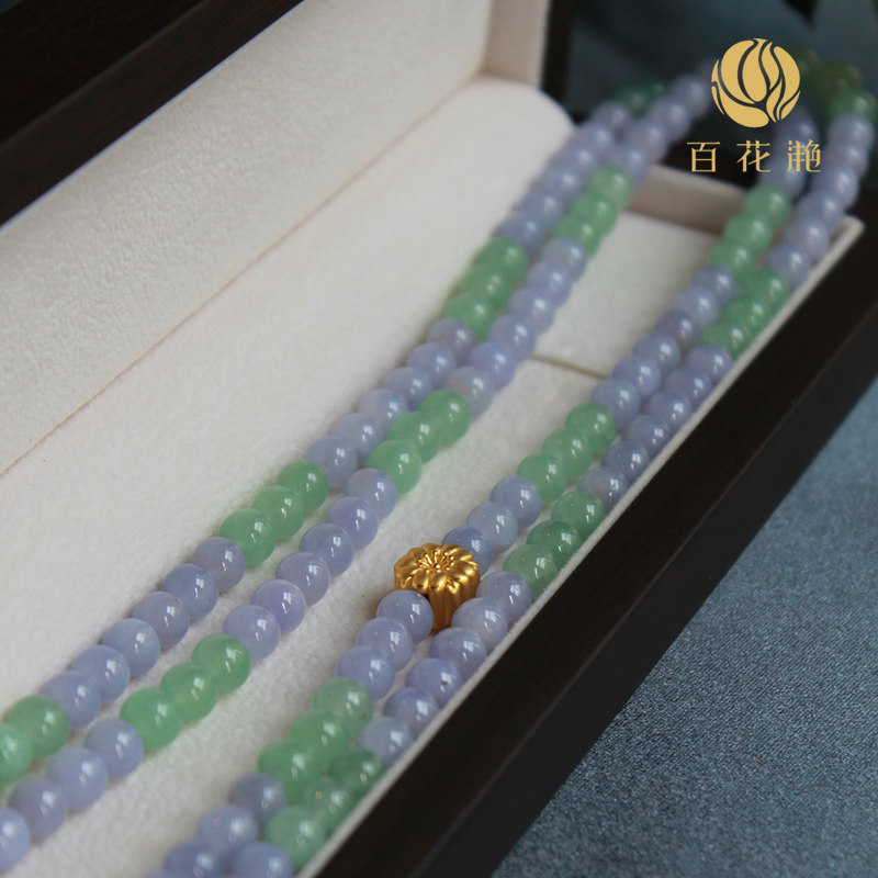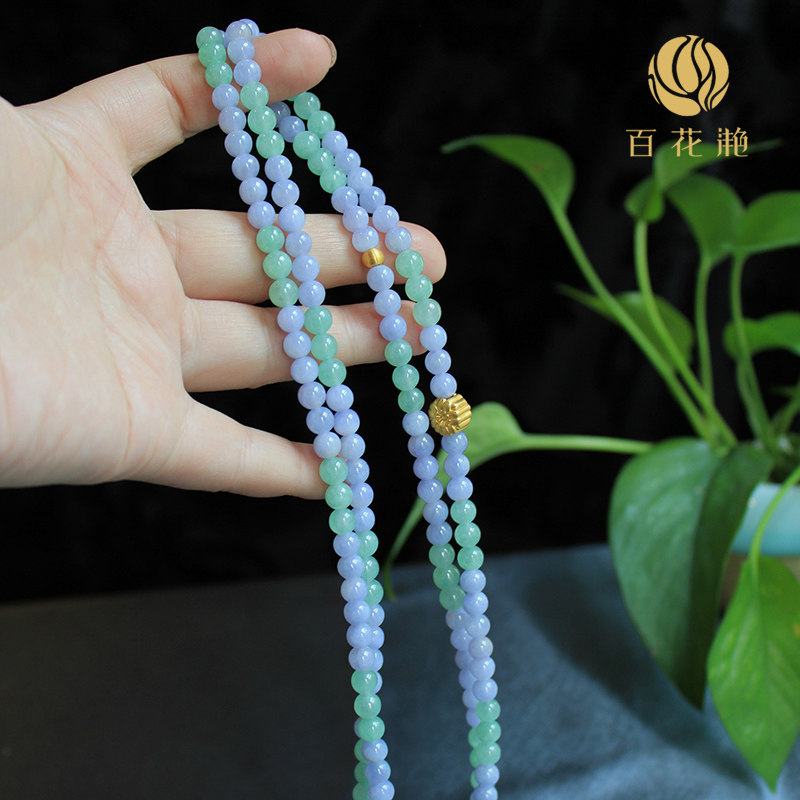 Изумрудное круглое ожерелье из бусинки составляет около 100 см.Диаметр единого шарика составляет 6,5 мм, а фиолетовые и зеленые двойные бальные точки имеют в общей сложности 162 штук.Ледяной и восковые виды, элегантные цвета, аксессуары для цветов персика и матовые бусины - это золотые аксессуары.Все ожерелье элегантно и уникальное, и представлен сертификат оценки авторитетных испытательных агентств.