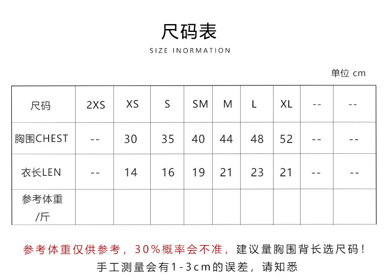 | Размер: | XS/обхват груди 30, длина по спине 14, S/обхват груди 35, длина по спинке 16, СМ/обхват груди 40, длина спины 19, М/обхват груди 44, длина по спинке 21, L/обхват груди 48, длина по спинке 23, XL/обхват груди 52, длина спины 21 |