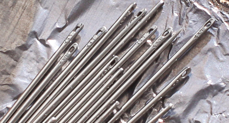 Длина иглы 4/0 составляет 5,4 см, относительно грубые точки, около 1,25 мм в диаметре и большие игольные глаза,Сравнивать2/0 стежков немного толще и прочнее, очень сильны, часто используются для необычайных материалов, таких как подошва обуви.