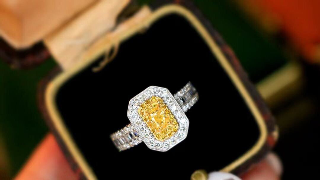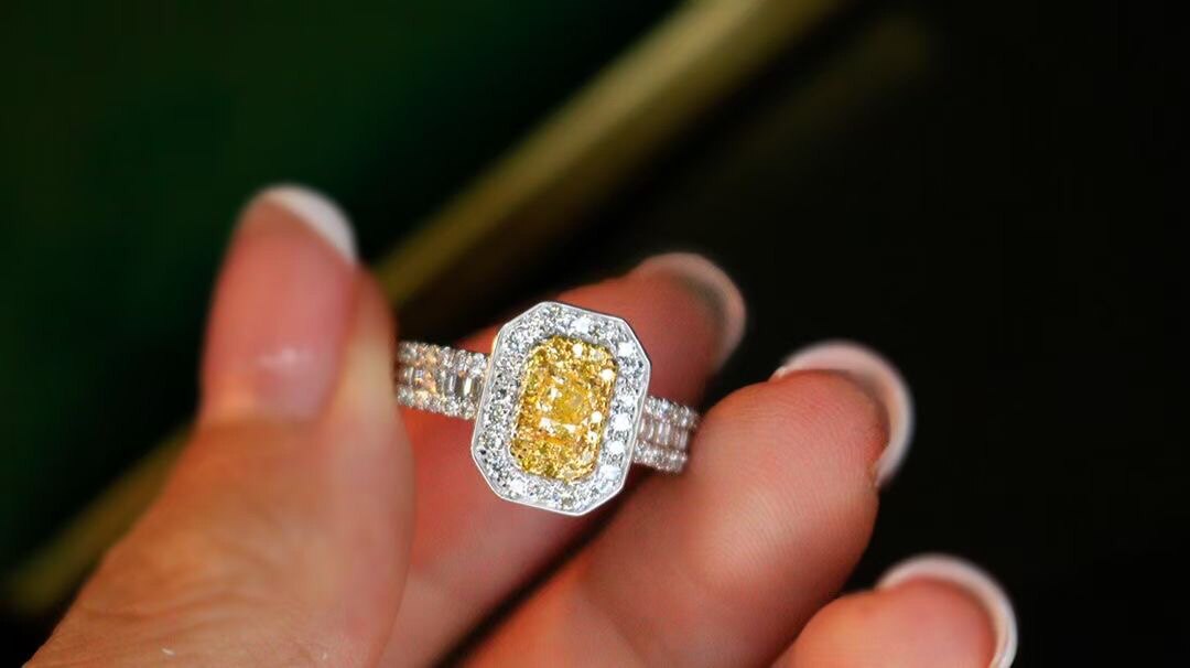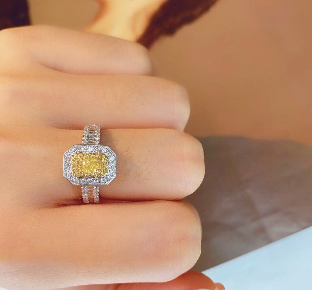 Необычайное желтое алмазное кольцо, кольцевая рука украшена большой квадратной тренировкой, которая имеет очень густое ощущение