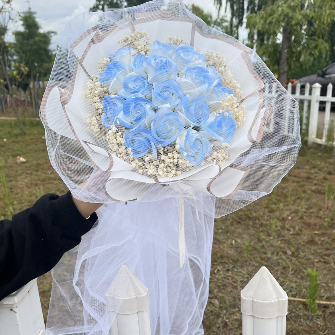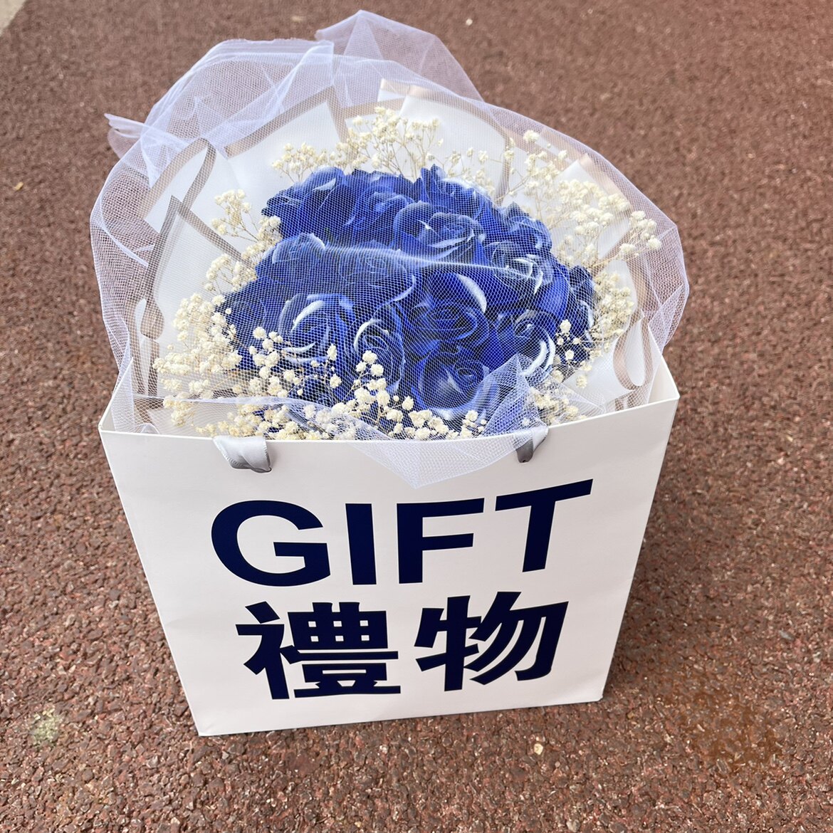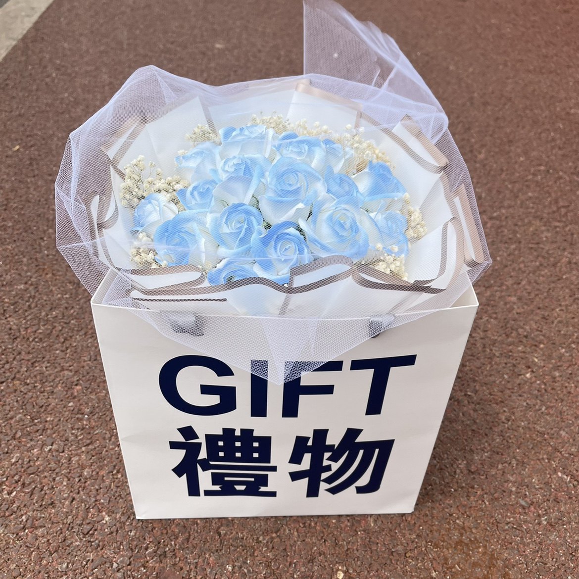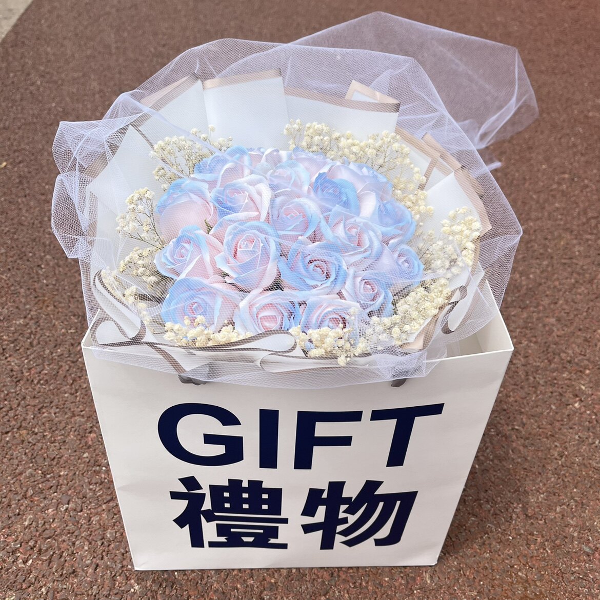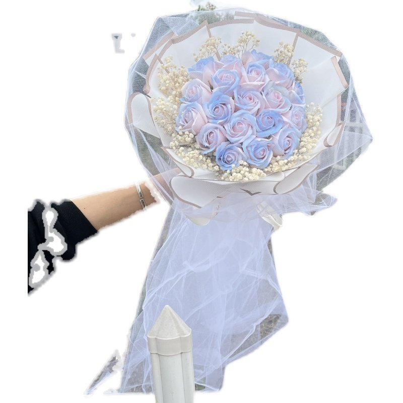 Продукты разбитого льда -синего цветочного букета с ритуальной сумкой Хаоксианская сеть красные моделирование цветы вечное мыло, давая парню и девушку День святого Валентина
