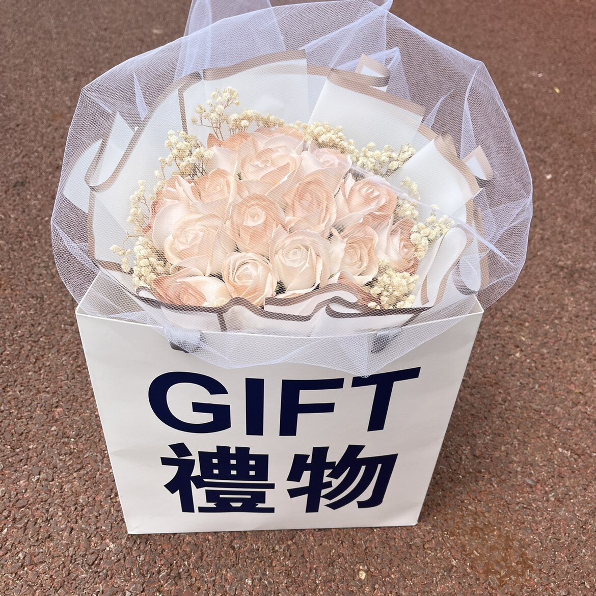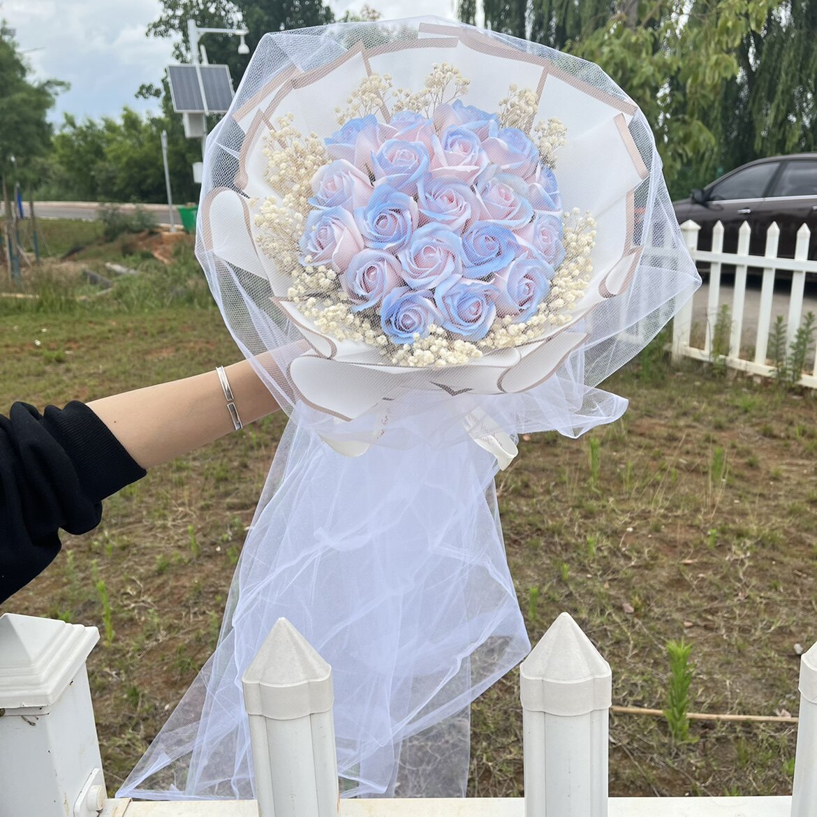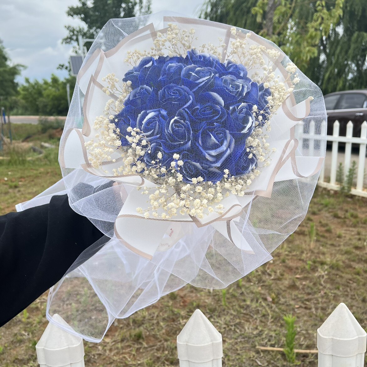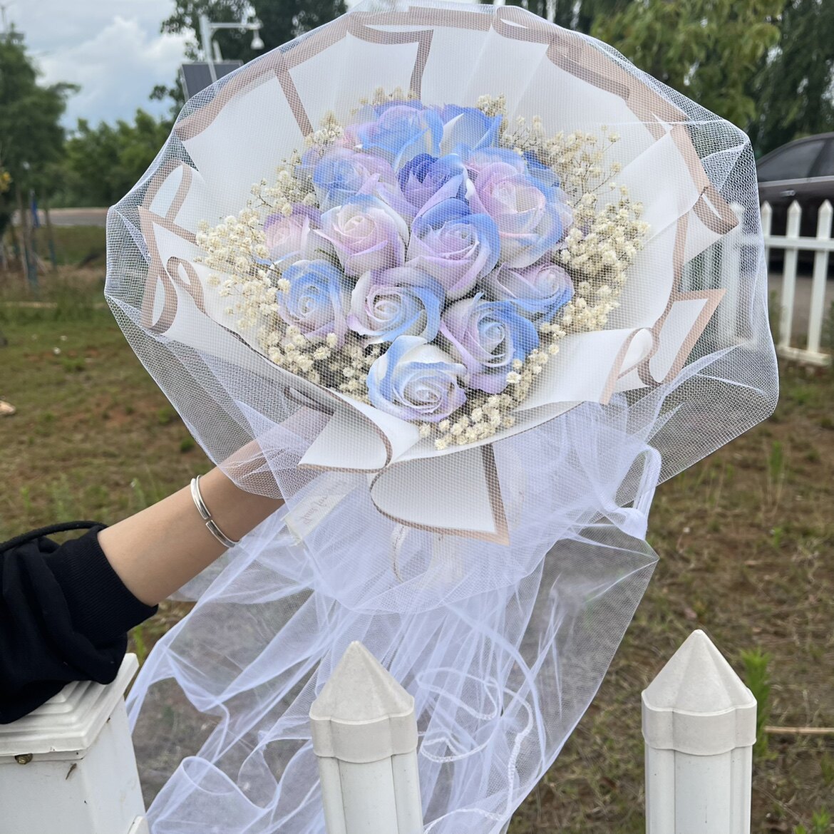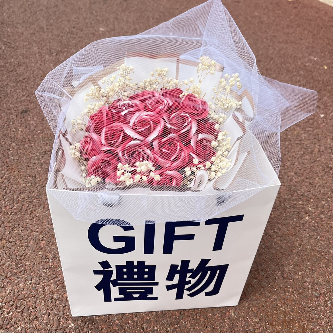 Продукты разбитого льда -синего цветочного букета с ритуальной сумкой Хаоксианская сеть красные моделирование цветы вечное мыло, давая парню и девушку День святого Валентина