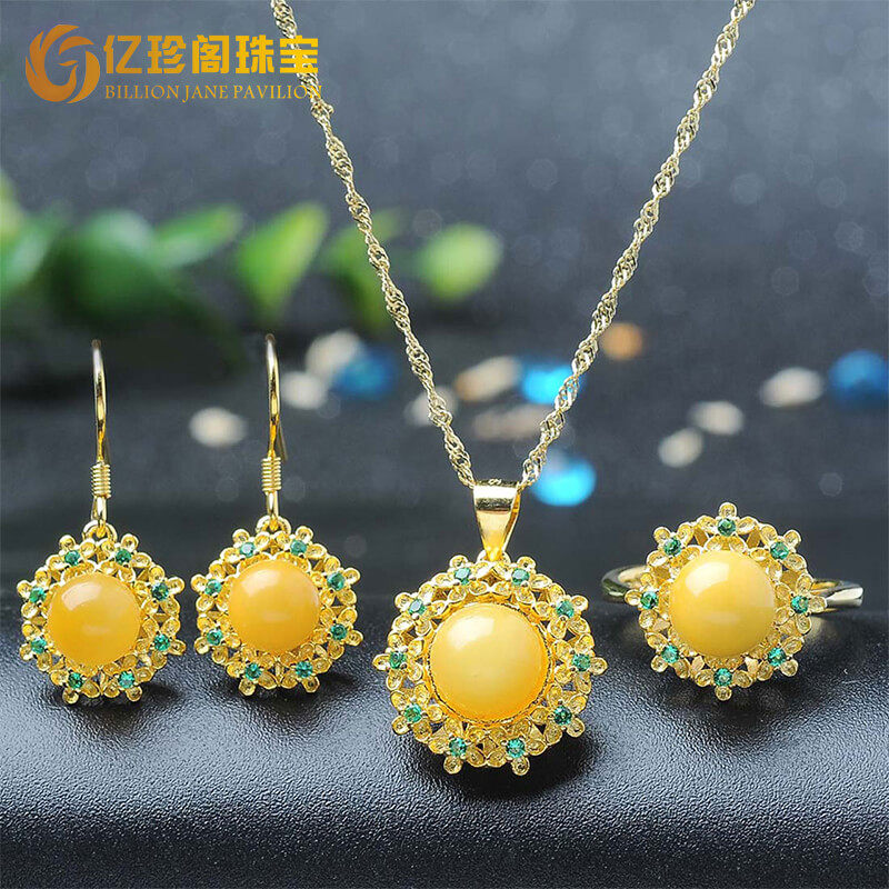 亿珍阁 Комплект из воскового агата, янтарное ожерелье и серьги, кольцо, аксессуар, серебро 925 пробы